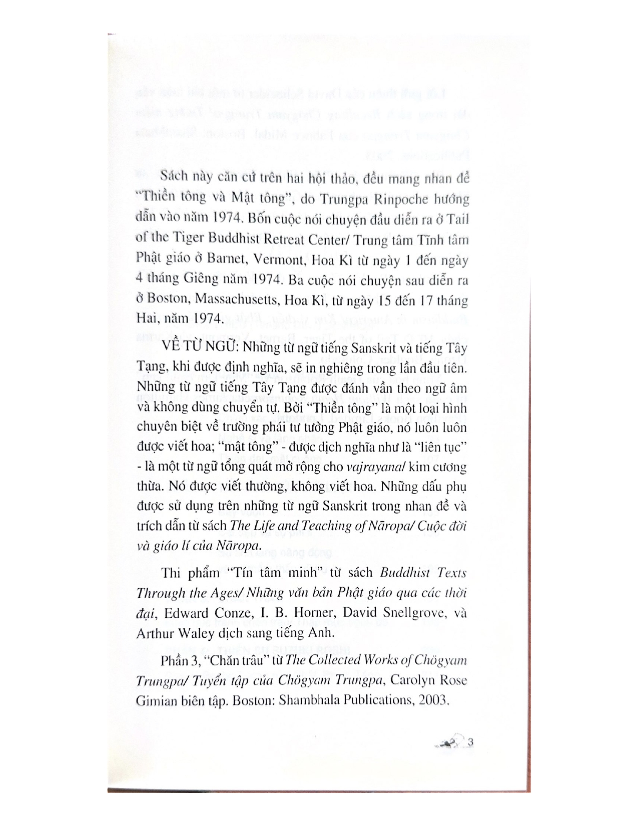 “Chögyam Trungpa Rinpoche đã làm chúng ta choáng ngợp với trí tuệ kim cương của một hành giả. Chúng ta hân hoan với trực quan của ông soi chiếu vào những đặc trưng của Thiền tông và mối quan hệ của Thiền tông với giáo lí mật tông. Cả một thế hệ Phật tử phương Tây được nuôi dưỡng trong trực quan ấy. Sách này nên ở trên kệ của bất kỳ ai muốn học hỏi nghiêm túc về Phật giáo.”