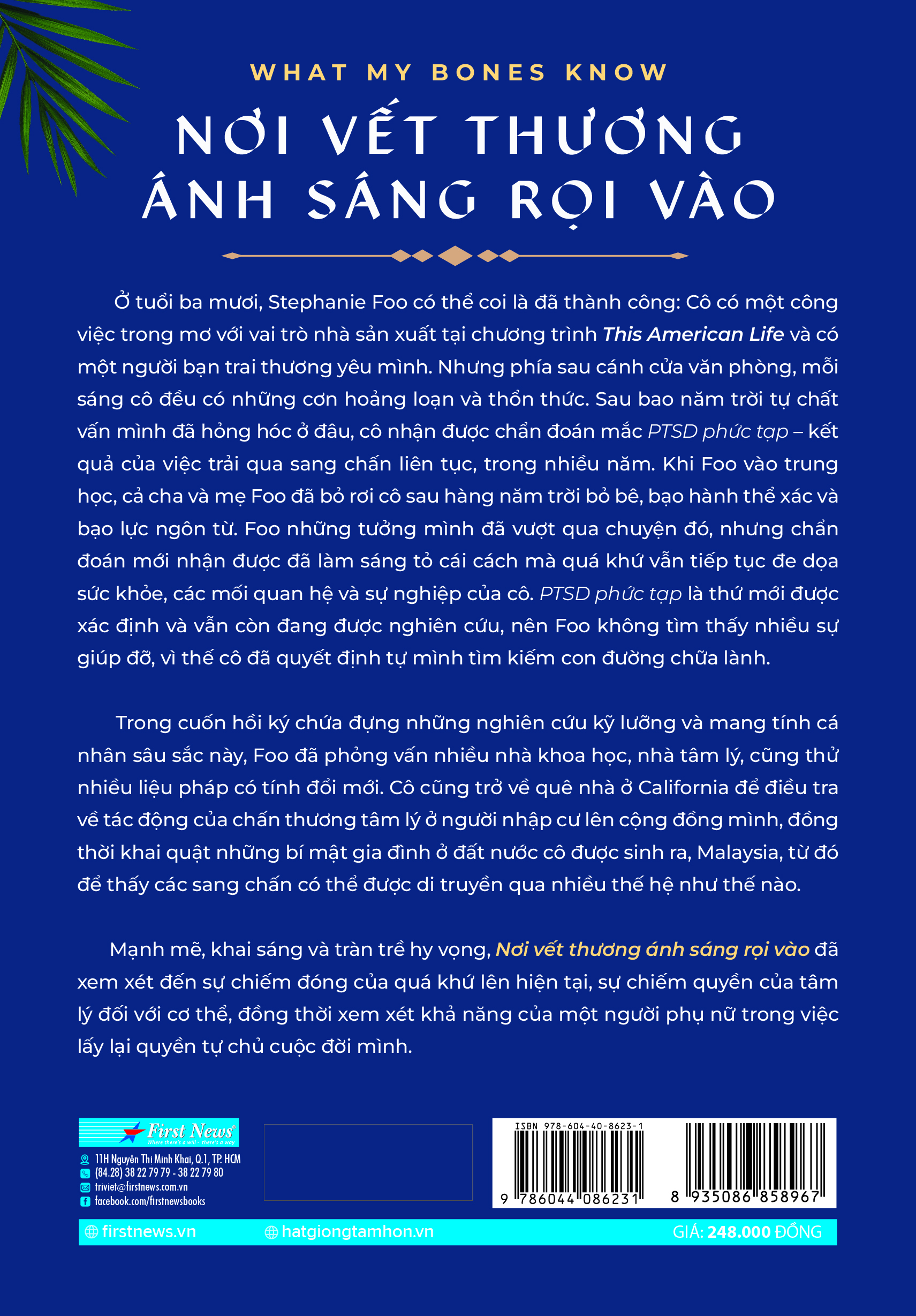 Cuốn sách “Nơi vết thương ánh sáng rọi vào” (tựa gốc: What My Bones Know: A Memoir of Healing from Complex Trauma) của tác giả Stephanie Foo, người Mỹ gốc Malaysia. Đây là một trong những cuốn sách hiếm hoi đề cập một cách chi tiết, sâu sắc và sống động về câu chuyện chữa lành của một người mắc chứng Rối loạn Căng thẳng Sau Sang chấn Phức tạp (C-PTSD).