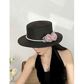 Nón đi biển mũ rộng vành chống nắng viền sọc phối đai ngọc trai nhân tạo 2 hoa trắng đen thời trang Hàn Quốc Chất liệu cói Kiểu dáng vành rộng Nón đi biển mũ