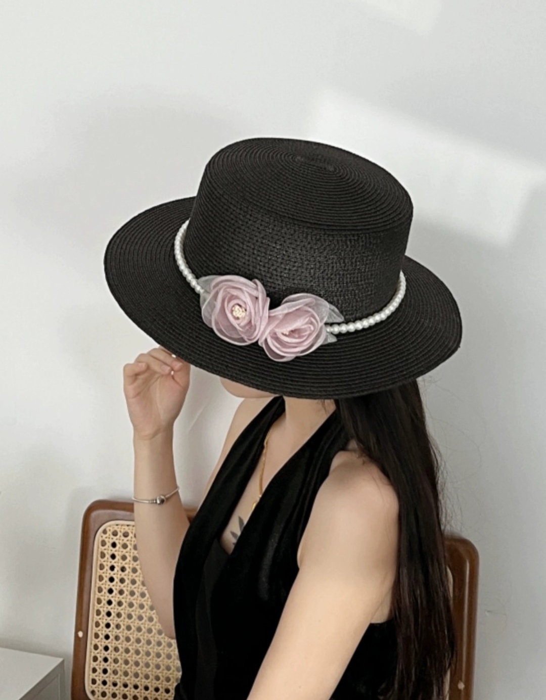 ✨Nón mũ rộng vành nhỏ chất liệu cói mũ rộng vành đi biển phối đai ngọc trai nhân tạo gắn 2 hoa màu hồng xinh mẫu mới thời trang Hàn Quốc dona24082508