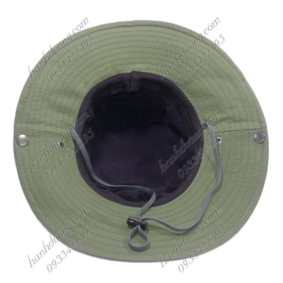 Vải Kaki dày dặn nhưng không nóng vì là 100%cotton. Có dây đeo không lo gió bay. Nút bấm kim loại 2 bên vành nón để bẻ lên cho ngầu luôn. Shop nhận thêu logo