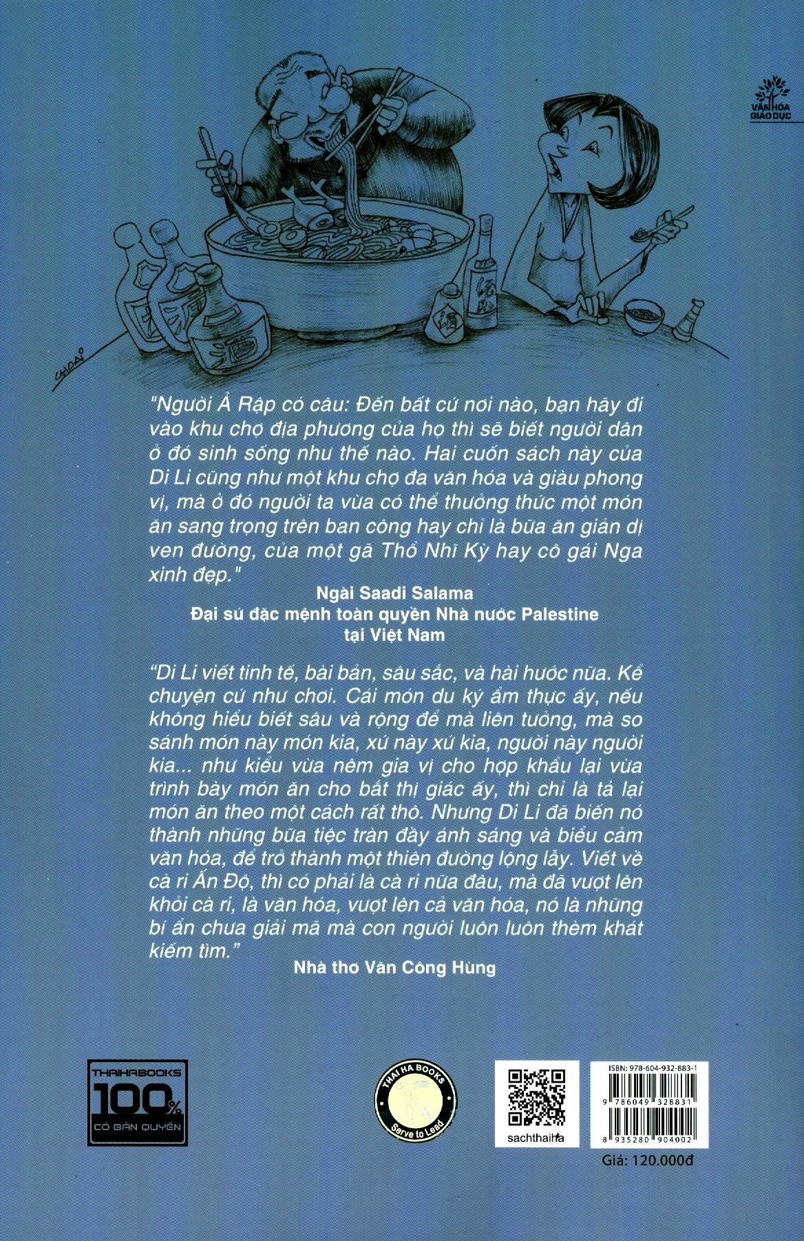 Nửa Vòng Trái Đất Uống Một Ly Trà “Chỉ cần qua dặm trang sách, Di Li đưa người ta từ Việt sang Nhật, từ Osaka tới Kobe, từ ngoài mưa vào trong bếp, cho người ta biết lịch sử ăn thịt của người Nhật, và khoa học hóa tuổi thọ của họ, hầu thỏa mãn trí tò mò của người đọc… Cuối cùng, Di Li mới kể-tả việc ăn thịt bằng mấy giác quan cùng với những kiến thức mờ ảo hư-thực kia, mà vẫn không quên báo giá. Đọc về ẩm thực kiểu này còn thấy “ngon” hơn là đi ăn thật. Đúng là văn du ký của một người chuyên viết chuyện trinh thám!” – Nhờ thơ Đỗ Trung Lai “Di Li viết tinh tế, bài bản, sâu sắc và hài hước nữa, kể chuyện cứ như chơi. Cái món du ký ẩm thực ấy, nếu không hiểu biết rộng và sâu để mà liên tưởng, để mà so sánh món này món kia, xứ này xứ kia, người này người kia…như kiểu vừa nêm gia vị cho hợp khẩu lại vừa trình bày món ăn cho bắt mắt thị giác thì chỉ là tả lại một món ăn theo một cách rất thô. Nhưng Di Li đã biến nó thành những bữa tiệc tràn đầy ánh sáng và biểu cảm văn hóa, để trở thành một thiên đường lộng lẫy. Viết về cà ri Ấn Độ thì có phải là cà ri nữa đâu, mà đã vượt lên khỏi cà ri, là văn hóa, vượt lên cả văn hóa, nó là những bí ẩn chữa giải mã mà con người luôn thèm khát kiếm tìm” – Nhà thơ Văn Công Hùng Nửa Vòng Trái Đất Uống Một Ly Trà - Cuốn sách du ký ẩm thực của tác giả Di Li. Với hơn 300 trang sách, Di Li đưa chúng ta chu du và thưởng thức ẩm thực từ vùng đất này đến vùng đất khác, khắp nơi thế giới. Bạn có thể tình cơ bắt gặp những chú bò Kobes hạnh phúc, đỉnh cao ẩm thực tối giản từ món Sushi của người Nhật, đến những món ăn mỹ vị Trung Hoa hay những món ăn từ Địa Trung Hải, Đại Tây Dươơn cả một cuốn sách du ký hay ẩm thực đơn thuần, cuốn sách hai trong một này sẽ đưa bạn từ bất ngờ này đến những bất ngờ khác để rồi bạn phải tự hỏi “phải chăng là mình đã đi vòng quanh thế giới?”.