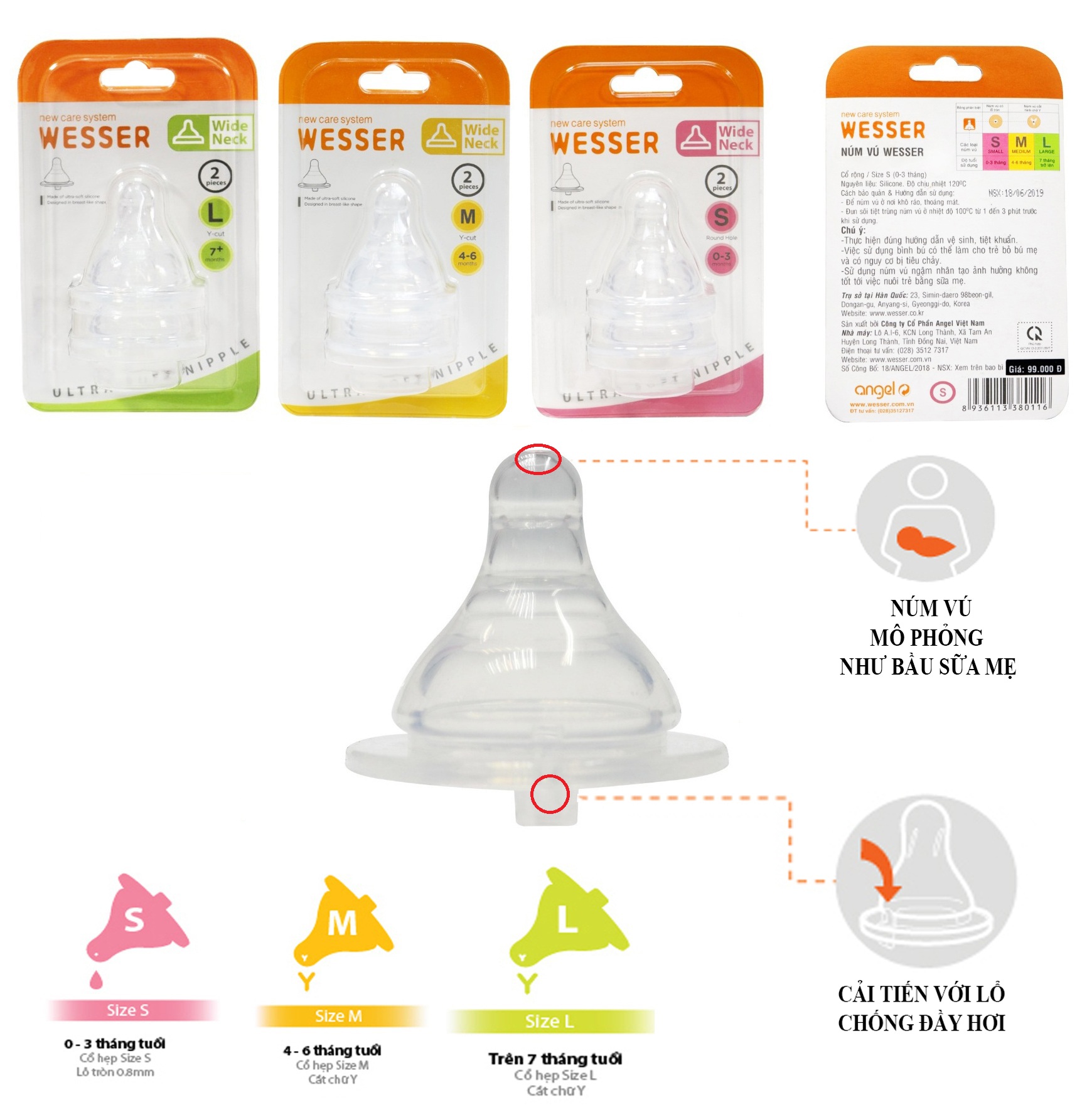- Núm ty cổ rộng Wesser có lỗ thông hơi thông minh làm giảm tối đa lượng khí bé nuốt vào giúp sữa chảy đều hơn, đồng thời tránh làm bé đầy hơi, chướng bụng sau khi bú.