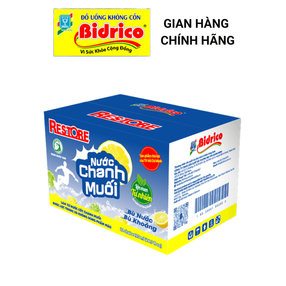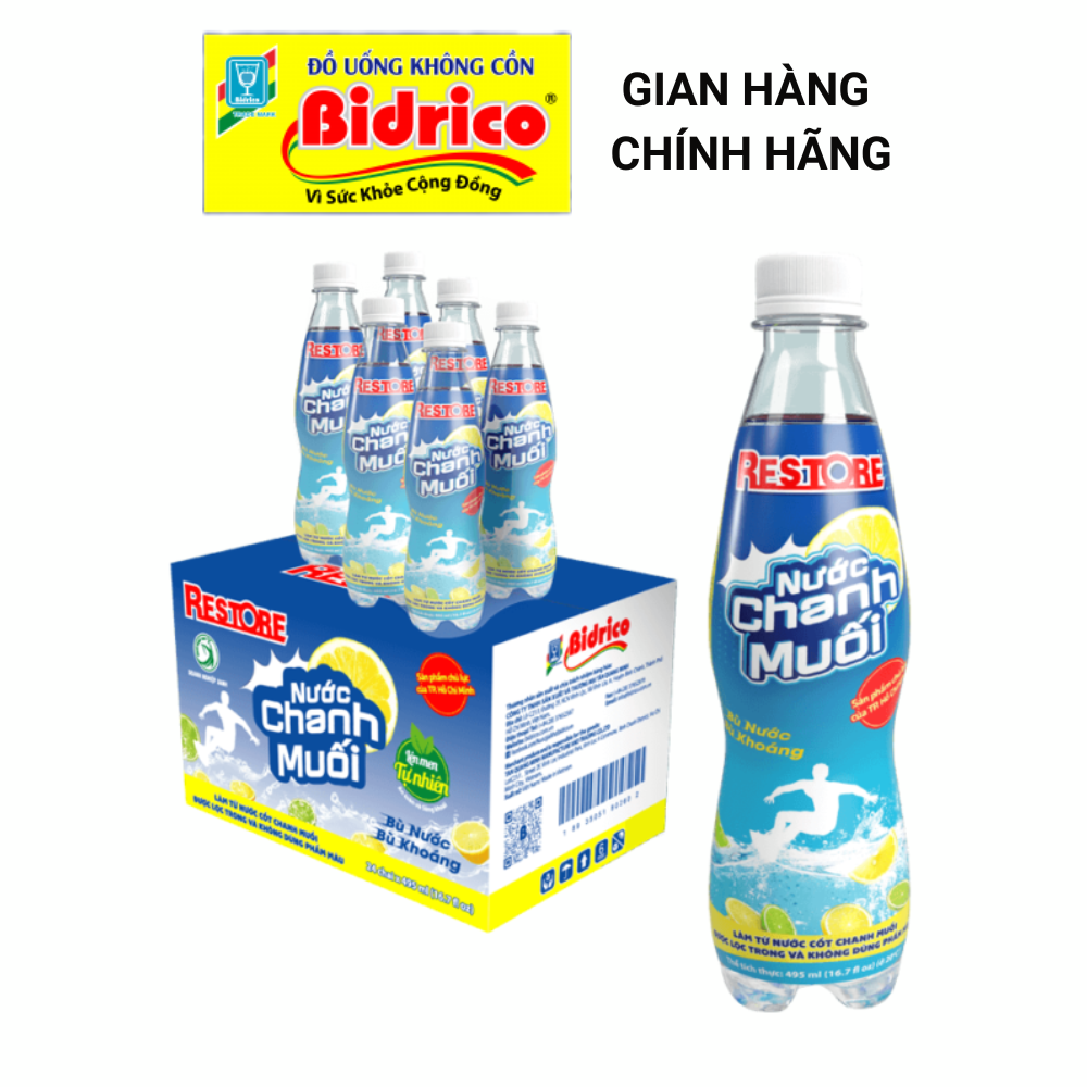 Mua tại TiktokNước Chanh Muối Restore ( Thùng 24 chai 495ml ) - Sản phẩm của Bidrico Đã khát và sảng khoái Nước chanh muối Restore 495ml vinh dự là sản phẩm chủ lực Tp.Hồ Chí Minh giai đoạn 2018-2020 và 2021-2025. Đồng thời là sản phẩm, dịch vụ tiêu biểu TP.HCM năm 2017 – 2023 và Sản phẩm công nghiệp và công nghiệp hỗ trợ tiêu biểu TP.HCM năm 2022 – 2023. Thông tin sản phẩm: