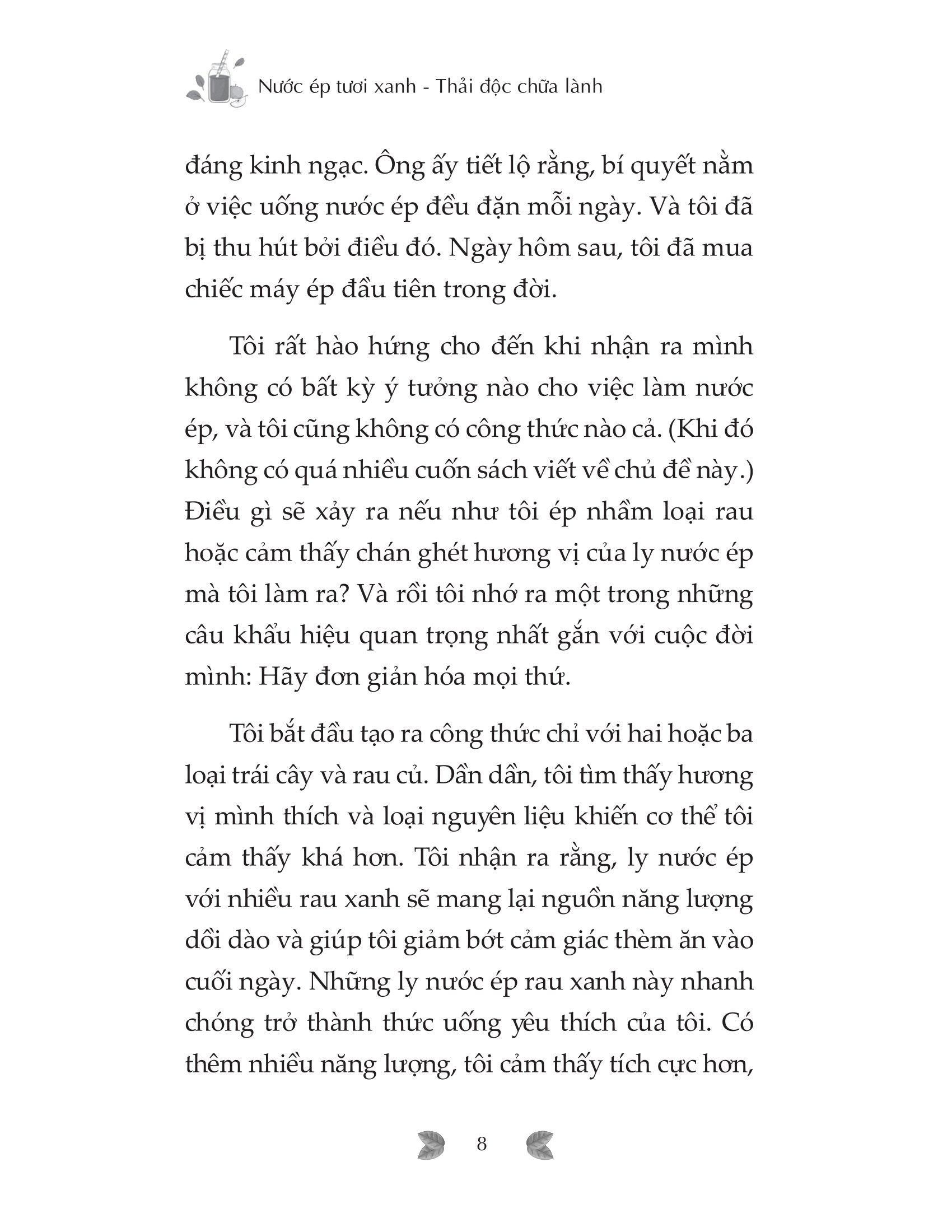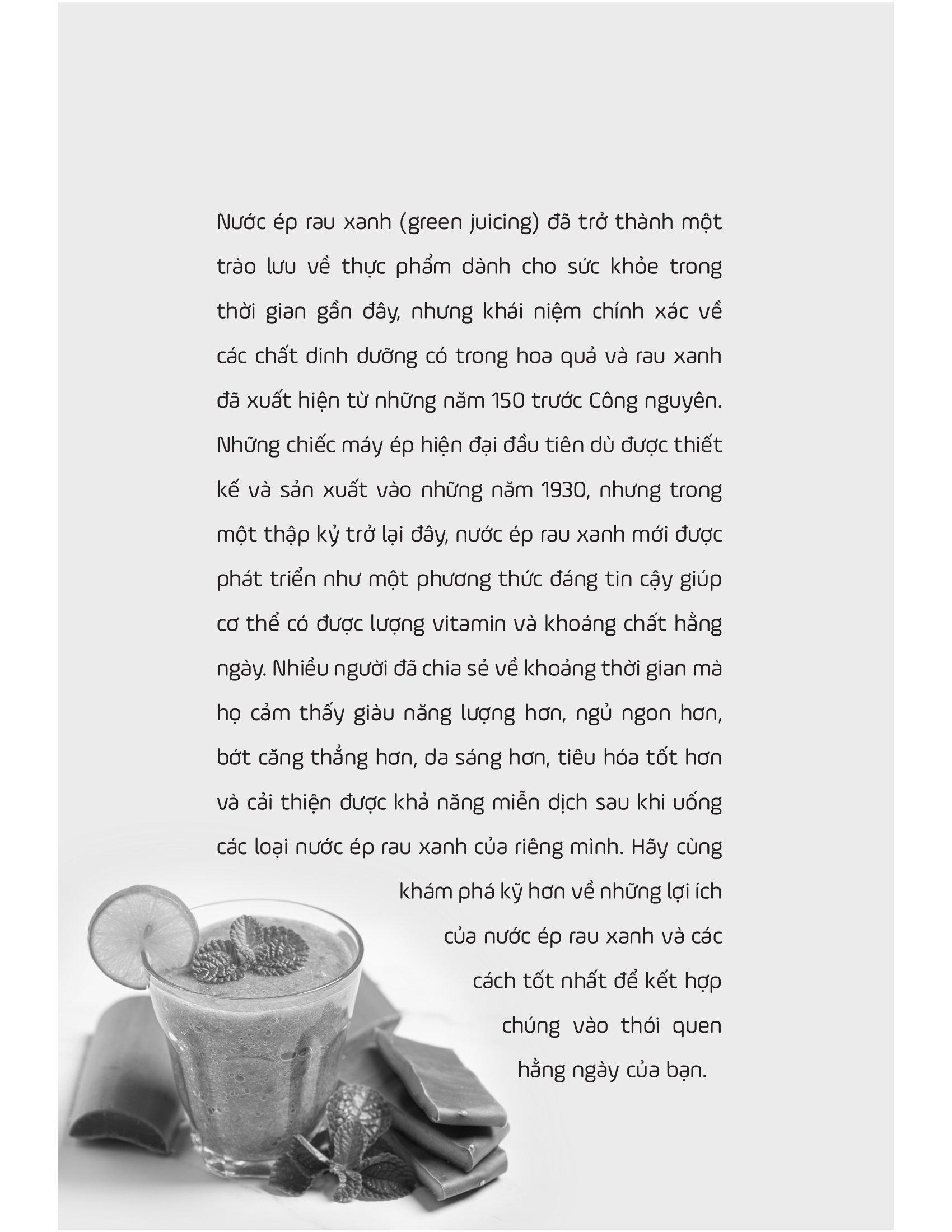 Tất cả các công thức nước ép rau xanh trong cuốn sách này đều bao gồm một số loại rau cùng với trái cây và các nguyên liệu dễ tìm. Mỗi công thức hiển thị một danh sách các thành phần, theo sau là hướng dẫn từng bước, các biến thể có thể có của công thức và tóm tắt nhanh các thông tin dinh dưỡng quan trọng như calo, carbs, hàm lượng chất xơ, Cuốn sách có tài liệu giáo dục ở phía trước, hướng dẫn chi tiết cho bạn về quy trình tạo ra một ly nước ép rau xanh ngon lành, cải thiện sức khỏe, cũng như một số bí quyết chọn máy ép tốt nhấ