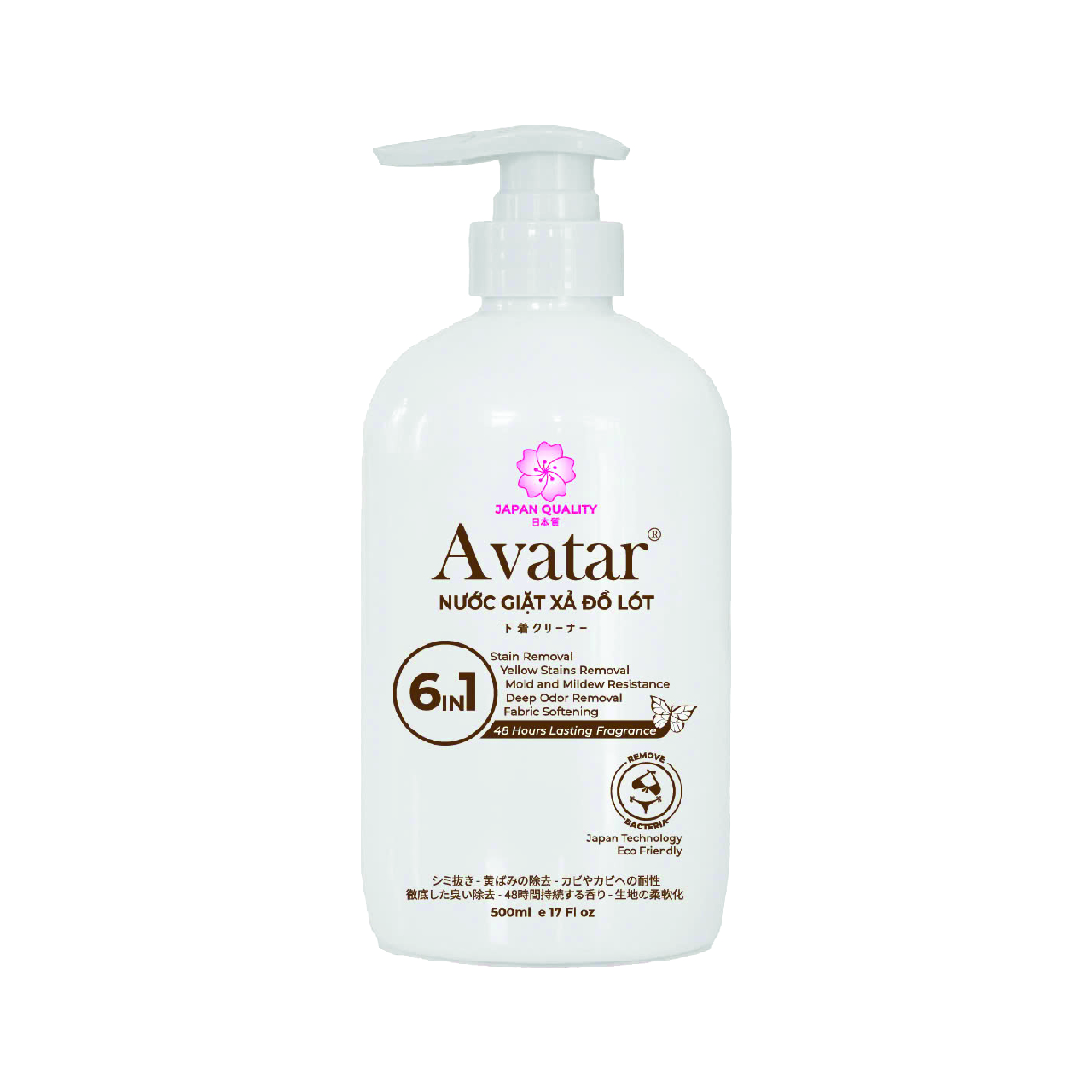 NƯỚC GIẶT XẢ CHUYÊN DỤNG CHO ĐỒ LÓT AVATAR Thương hiệu: Avatar Xuất xứ: Việt Nam theo công nghệ Nhật Bản Mùi hương: Hoa anh đào ngọt ngào Dung tích thực: 500ml HSD: 3 năm