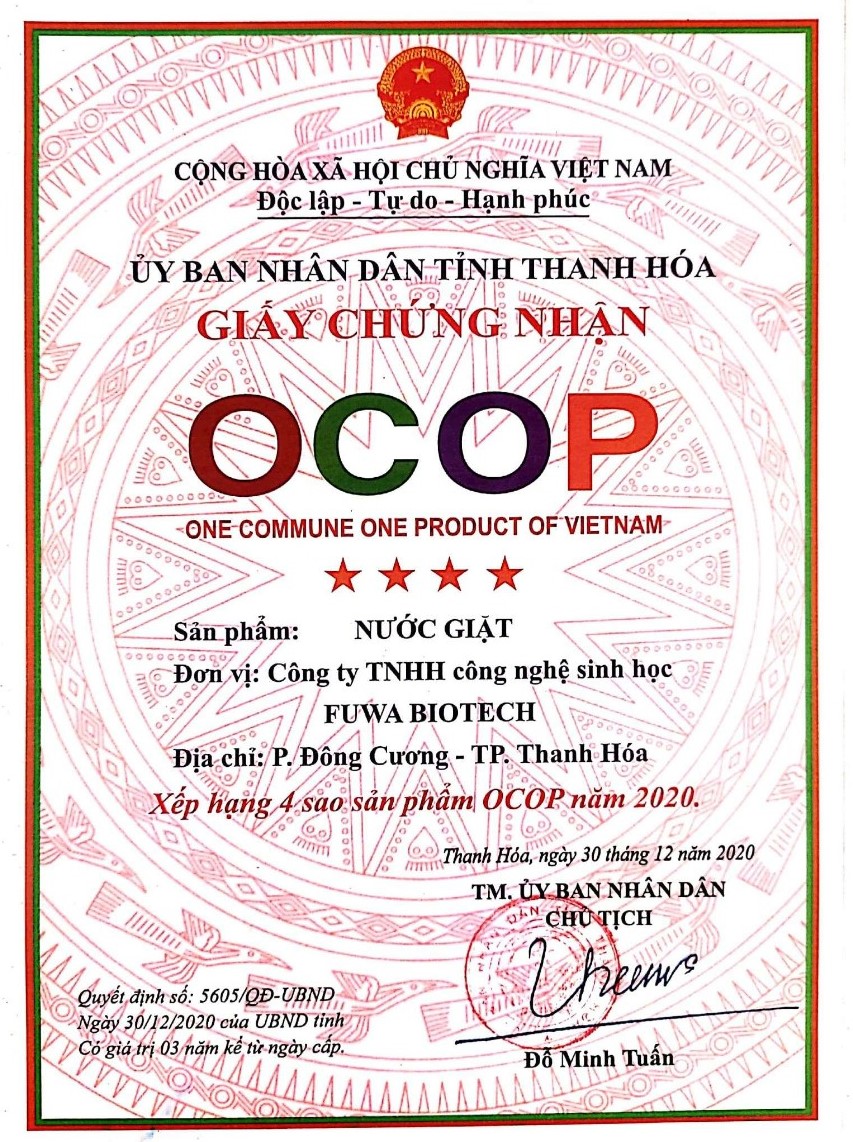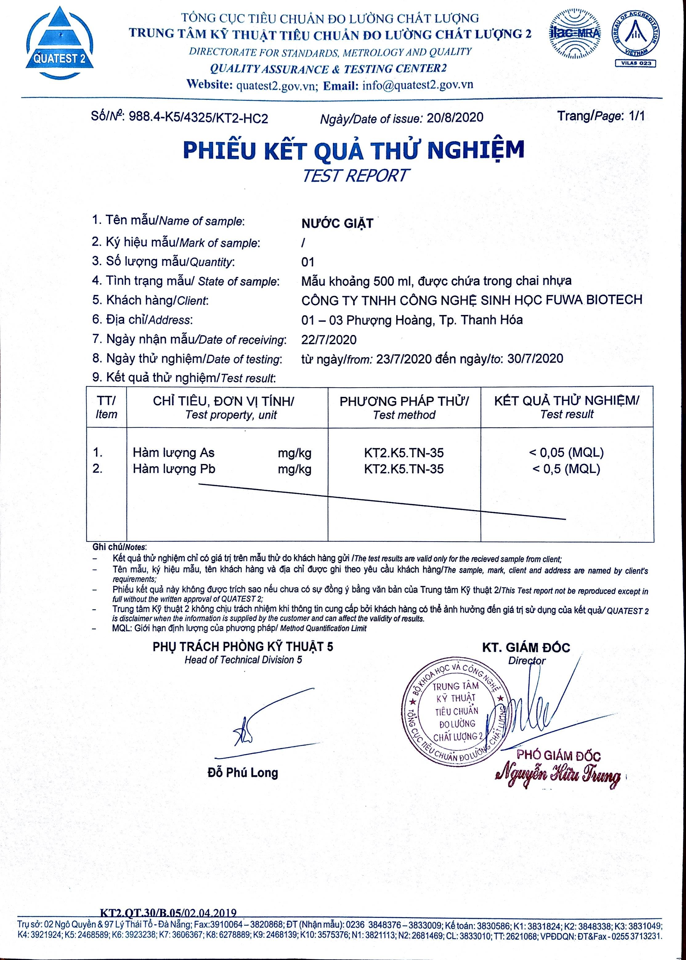 Nước giặt hữu cơ Fuwa3e ứng dụng công nghệ lên men vỏ dứa với Enzyme Bromelain có trong dứa có hoạt tính làm tan và tẩy sạch các vết bẩn. Sản phẩm không chứa hoá chất độc hại, chất tẩy trắng và hương liệu nên phù hợp giặt đồ cho trẻ sơ sinh, đồ lót, khăn. Sản phẩn đạt chuẩn không kích ứng da được kiểm định bởi Quatest 2. Một đặc điểm nổi bật của sản phẩm là nước thải sau khi giặt có thể dùng trực tiếp để tưới cây, các enzyme trong nước thải sẽ làm sạch đất và cung cấp thêm lợi khuẩn cho cây trồng.