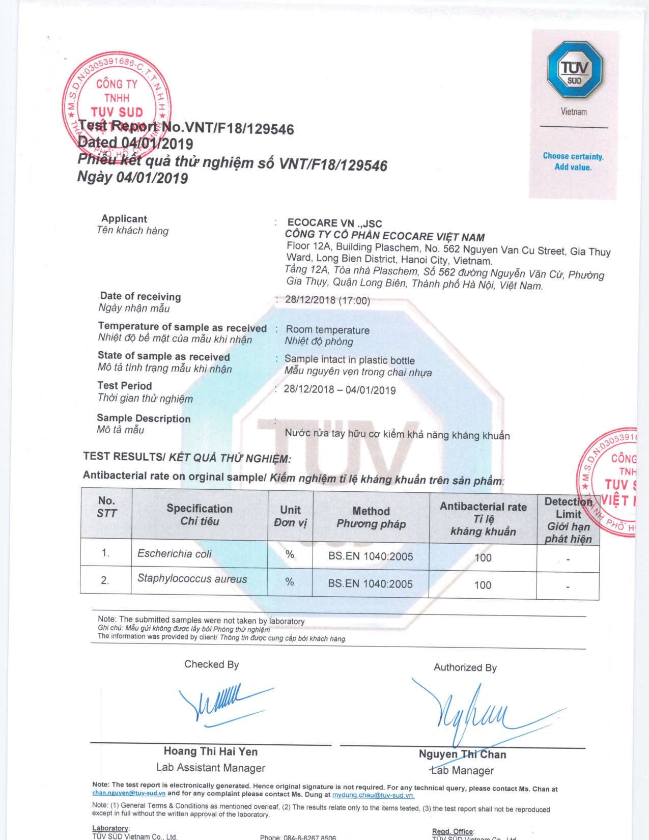 • Sản phẩm đã đạt chứng nhận diệt khuẩn 100% do Cơ Quan Thanh Tra Kỹ Thuật Đức ( TUV-SUD)