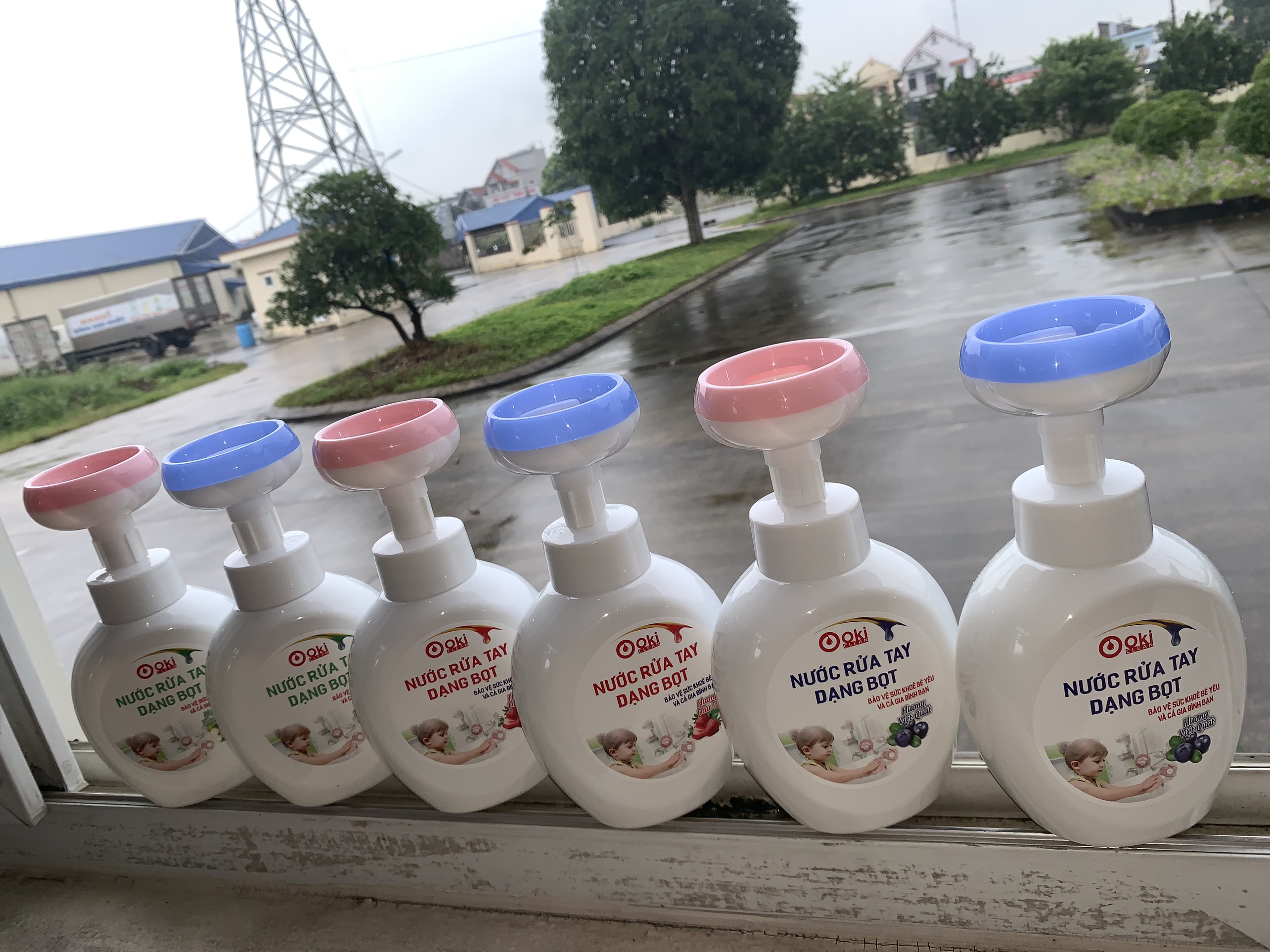 - KHÔNG phẩm màu Công Dụng: Có khả năng diệt được 99,99% vi khuẩn có hại và đồng thời kéo trôi đi các chất dơ bẩn trên tay. Bọt tuyết sử dụng tiết kiệm hơn tới 3 lần so với các sản phẩm thông thường khác nhờ thiết kế đặc biệt của bơm tạo bọt. Không chứa xà phòng, không chứa xút, độ PH cân bằng giúp bảo vệ làn da nhạy cảm nhất của bé. Mùi hương tự nhiên dịu nhẹ rất dễ chịu Đặc biệt có tính khử độc tốt, ngay cả khi vừa dùng xong vẫn có thể cầm nắm thức ăn, đồ dùng mà không gây độc. Tác dụng làm sạch và khử trùng da tay. An toàn cả với những làn da nhạy cảm nhất là khi dùng cho trẻ em. Cách Dùng : Nước rửa tay dạng bọt OKI Bước 1: Tháo khoá vòng trên cổ chai Bước 2: Đặt lòng bàn tay phẳng trên nắp. Nhấn 1 lần nhẹ nhàng từ trên xuống. Lưu ý: Giữ tay khô trước khi nhấn nắp Bước 3: Xoa đều tay cho tan hết bọt hoa Bước 4: Rửa sạch với nước. Quy cách đóng gói: chai Thể tích: 500g Hương Dâu Tây. Hạn sử dụng: 3 năm kể từ ngày sản xuất Chỉ cần lấy 1 lượng nước thích hợp ra tay và chà sát nhẹ nhàng Dùng cho cả gia đình, trẻ em dùng dưới sự giám sát của người lớn. Xuất xứ: Việt Nam Giá: 99k̵ --->75k / chai hình bông hoa, hình chân gấu 500g. (màu nắp ngẫu nhiên) Lưu ý: