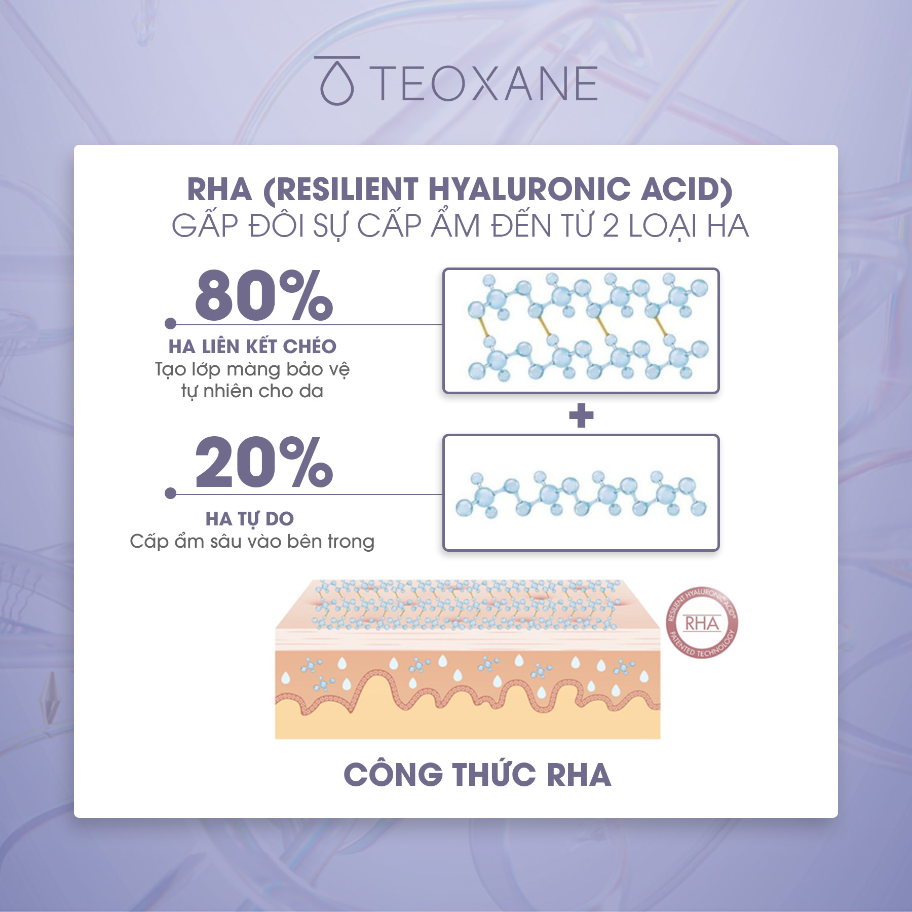 - RHA resilient hyaluronic acid (Giữ ẩm lâu và củng cố hàng rào bảo vệ da)