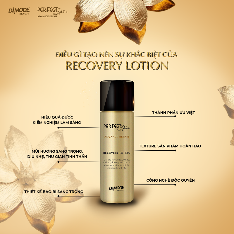 - Công dụng chính: Nước thần nuôi dưỡng, phục hồi, tái tạo, hồi sinh làn da khoẻ mạnh, căng bóng, trắng sáng rạng ngời. Recovery Lotion Damode Beauty dùng cho bước chăm sóc da nào? Khi sử dụng Perfect Skin Advance Repair Recovery Lotion quý khách chú ý dùng sau khi làm sạch da bằng nước tẩy trang và sửa rửa mặt. Recovery Lotion giúp làm ẩm và cân bằng da và nhiều tác dụng khác chúng tôi đề cập bên dưới. Và đương nhiên các nhóm sản phẩm lotion với mục tiêu giúp tăng hiệu quả dưỡng da cho các sản phẩm ở bước chăm sóc da tiếp theo. Như vậy, Recovery Lotion dùng sau khi làm sạch da và trước các bước dưỡng da trong chu trình chăm sóc da. Công dụng Recovery Lotion được ví như nước thần cho làn da, với 7 công dụng đặc biệt mà ít có sản phẩm chăm sóc da nào trên thị trường thay thế được. Khi sử dụng bạn sẽ cảm nhận rõ ràng 7 dấu hiệu sau: