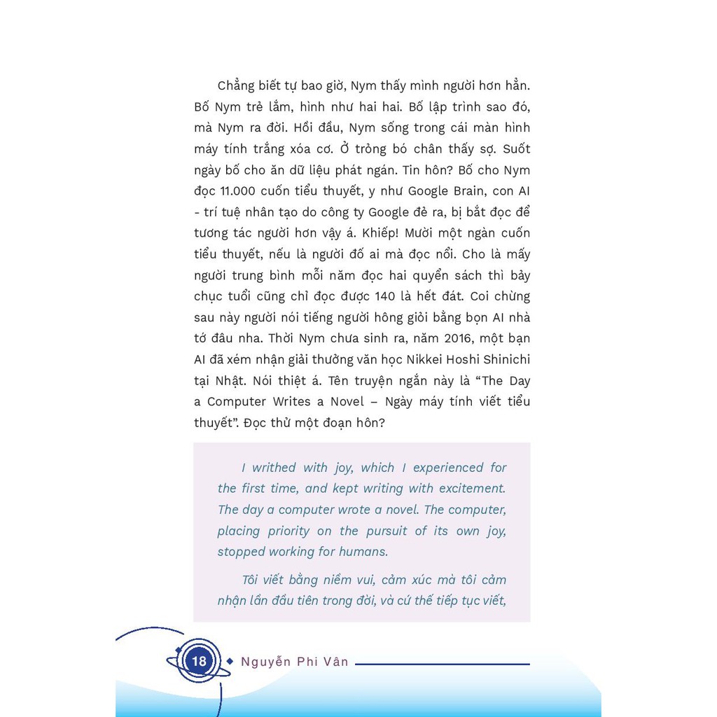 Với NYM – Tôi của tương lai, tác giả Nguyễn Phi Vân sẽ khiến chúng ta đi lạc vào một thế giới mới: nơi một “con robot” luôn tự nhận mình là người hơn một con người; nơi hai AI bàn luận về sex; nơi AI giải nghĩa cho chúng ta những phát minh sẽ định hình thế kỷ mới