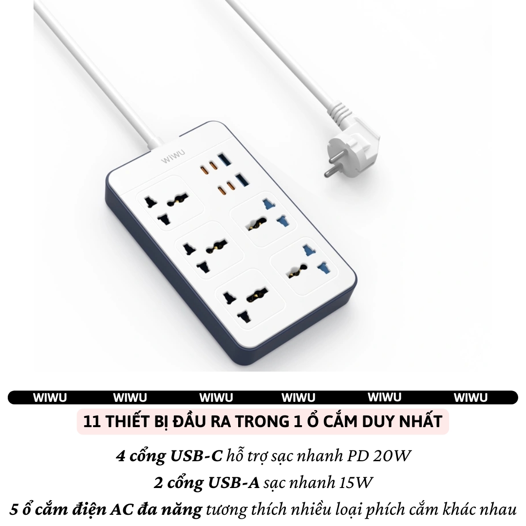 ✨Ổ cắm điện đa năng 11 in 1 2500W WIWU Wi-S006 PS524 4 cổng Type-C (PD 20W), 2 cổng USB-A (2.4A), 5 ổ cắm AC, dây điện dài 2m, Chống cháy, Chip Ai an toàn sạc cho iPhone ipad Macbook Vivo oppo samsung huawei - Hàng nhập khẩu