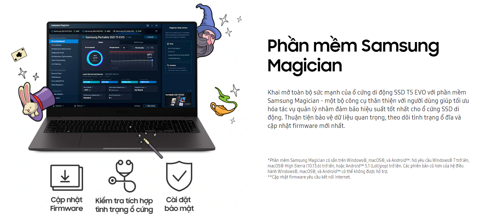 *Khả năng tương thích với T5 EVO có thể thay đổi tùy thuộc vào thiết bị máy chủ. Một số hệ điều hành có thể yêu cầu định dạng lại T5 EVO. T5 EVO tương thích ngược với USB 3.1, USB 3.0 và USB 2.0. T5 EVO tuân theo các đặc điểm kỹ thuật nguồn điện USB chính thức. Nếu thiết bị máy chủ không có thông số kỹ thuật phù hợp, có thể dẫn đến kém tương thích và/hoặc hiệu suất giảm.