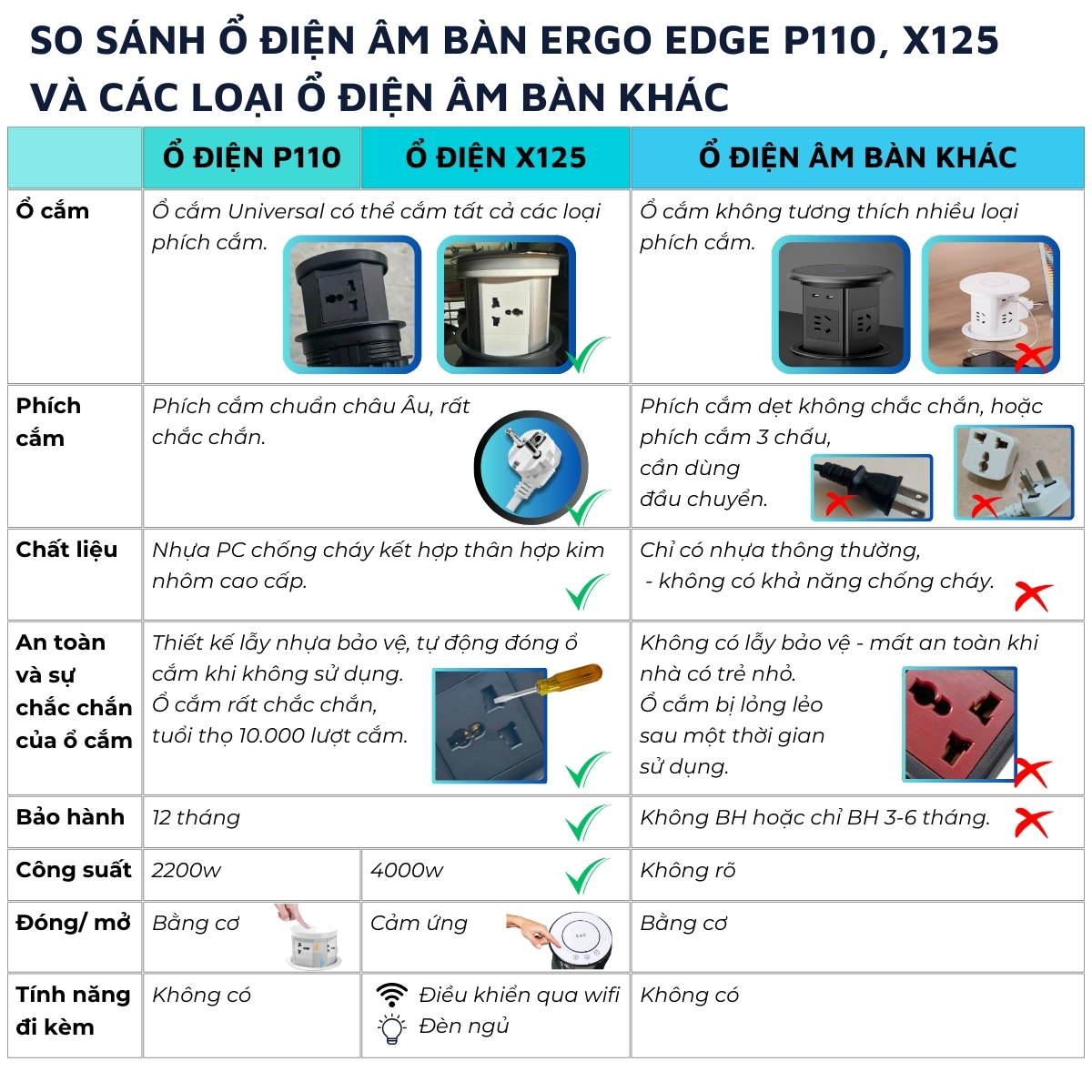Các loại ổ điện Ergo Edge: + P110, công sất tối đa 2200w: ổ điện thông minh với sạc nhanh không dây 15W. Cùng với 3 phích cắm và 1 cổng USB + 1 cổng