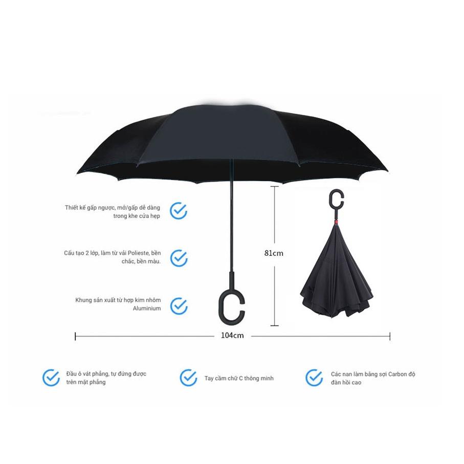 - Không bị ướt khi đóng lại: Chiếc dù mở ngược được mở từ bên trong ra ngoài, giống như một nụ cây nở hoa khi đóng lại mặt ngoài che mưa sẽ được giấu trong, còn mặt trong (khô ráo) sẽ trở thành mặt ngoài, vì vậy, có thể thoải mái cầm dù mà không sợ bị ướt, và nước mưa cũng sẽ không nhỏ giọt xuống sàn nhà như loại dù truyền thống Không làm ướt sàn ô tô, sàn nhà: Đó là nhờ thiết kế đóng dù sáng tạo đồng thời chất liệu dù không thấm nước, chia làm 2 lớp thông minh