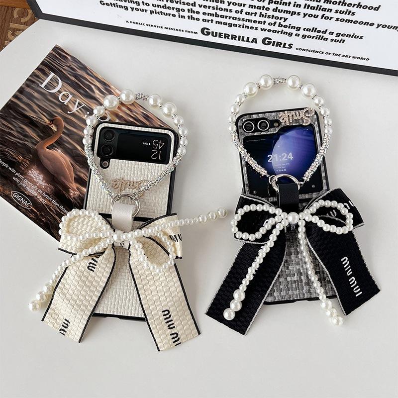 ✨Ốp Lưng Cho Samsung Galaxy Z FLip 6 / Z Flip 5 / Z Flip 4 Smile Đính Đá Nơ To Bản Kèm Dây Ngọc Trai Cầm Tay Xinh Xắn