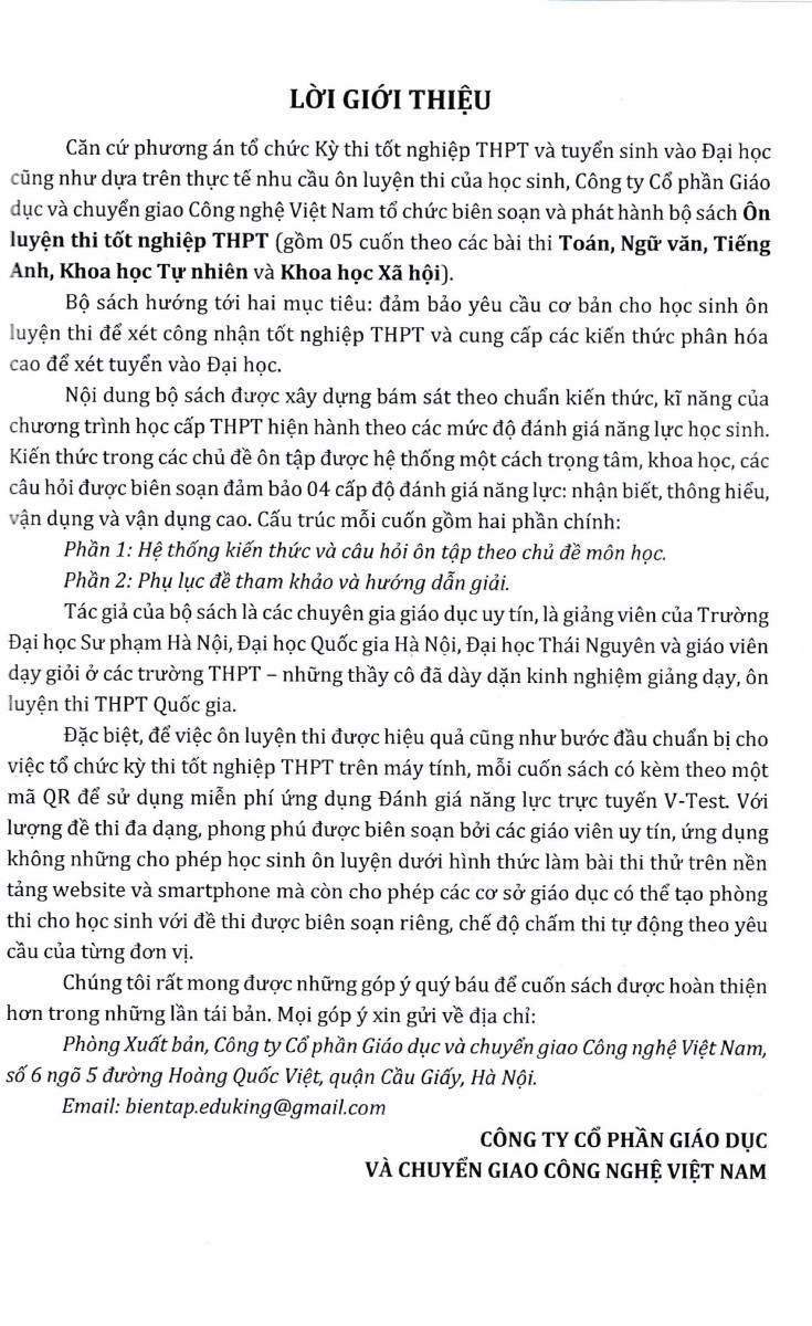 Căn cứ vào phương án tổ chức Kỳ thi tốt nghiệp THPT và tuyển sinh vào Đại học, Cao đẳng năm 2022 cũng như dựa trên thực tế nhu cầu ôn luyện thi của học sinh, Công ty CP Giáo dục và Chuyển giao công nghệ Việt Nam tổ chức biên soạn và phát hành bộ sách Luyện đề thi tốt nghiệp THPT năm 2022 (bao gồm 05 cuốn theo các bài thi Toán, Ngữ văn, Tiếng Anh, Khoa học Tự nhiên và Khoa học Xã hội).