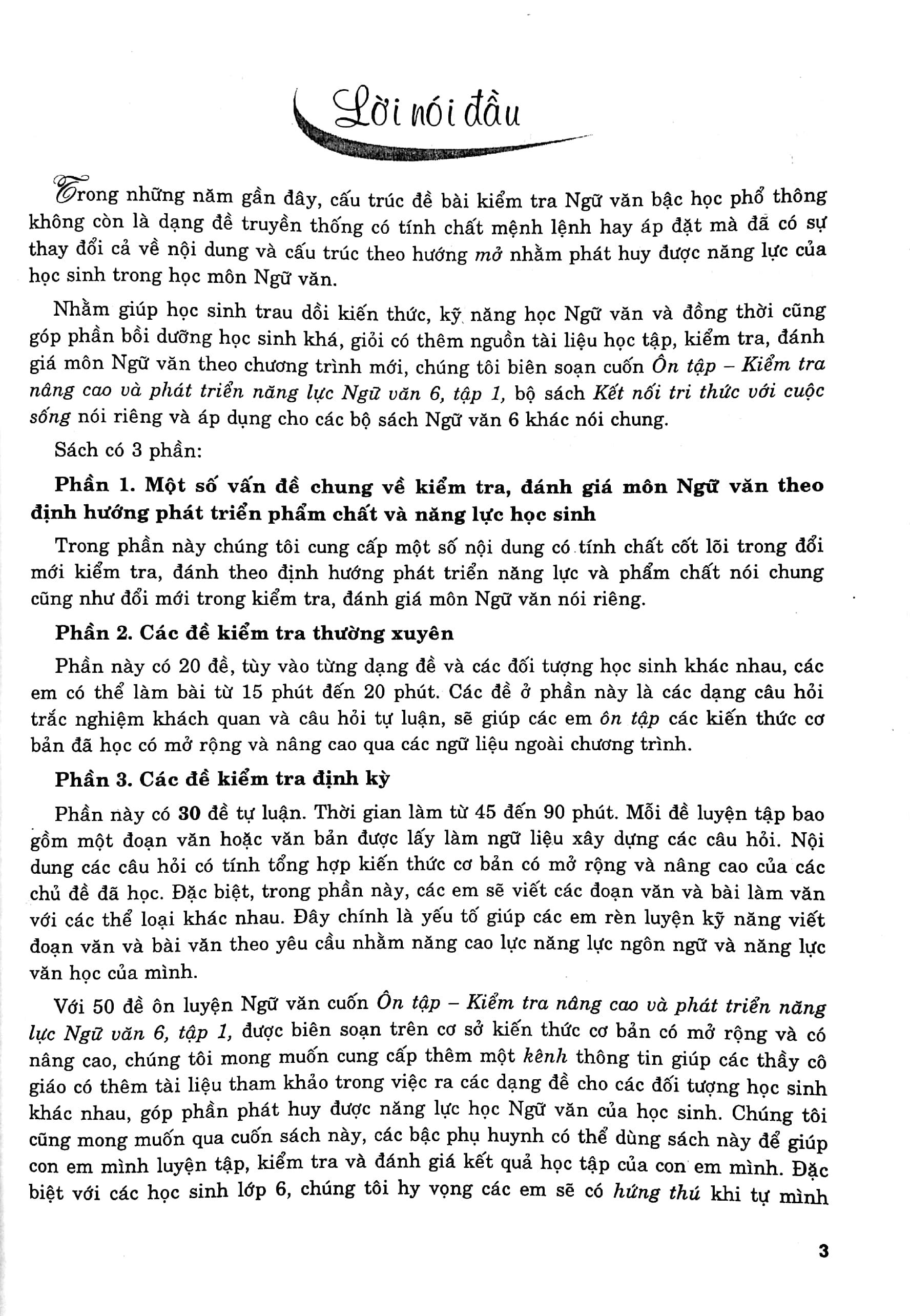 Nhằm giúp học sinh trau dồi kiến thức, kỹ năng học Ngữ văn và đồng thời cung góp phần bồi dưỡng học sinh khá, giỏi có thêm nguồn tài liệu học tập, kiểm tra, đánh giá môn Ngữ văn theo chương trình mới, chúng tôi biên soạn cuốn Ôn tập - Kiểm tra nâng cao và phát triển năng lực Ngữ văn 6, tập 1, bộ sách Kết nối tri thức với cuộc sống nói riêng và áp dụng cho các bộ sách Ngữ văn 6 khác nói chung.