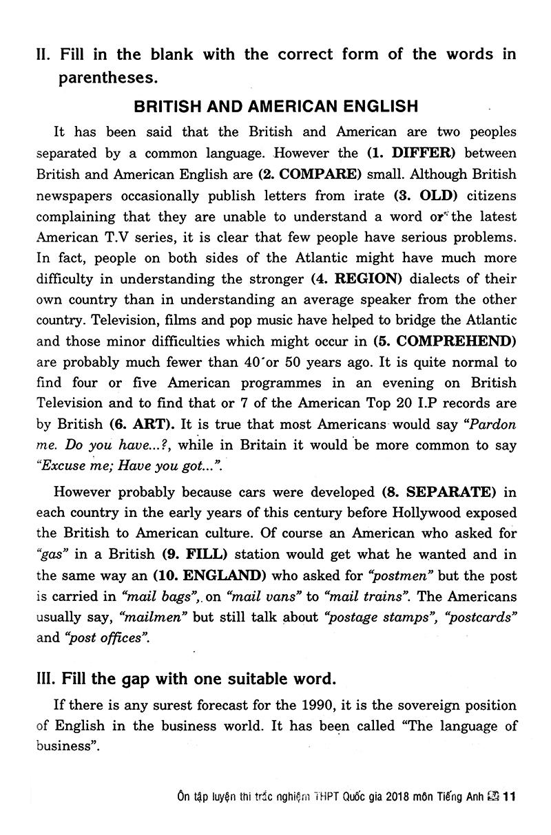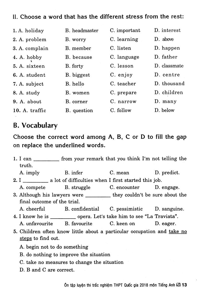 Cấu trúc đề thi và bài tập đều được chọn lọc theo tiêu chí: sát với đề thi nhất có thể. Lời giải chi tiết cũng được cải tiến, giúp các em hiểu sâu vấn đề, các từ vựng trong bài đều được giải nghĩa và cung cấp ví dụ cùng lời dịch. Như vậy, ngoài việc hiểu từ ra, các em còn biết được cách dùng từ - một yếu tố vô cùng hữu ích để làm tốt phần tự luận hoàn thiện câu và viết câu.