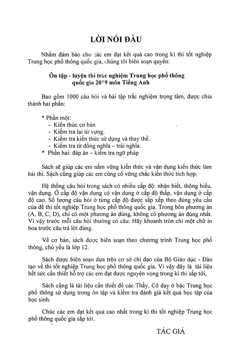Quyển sách Ôn Tập Luyện Thi Trắc Nghiệm THPTQG 2019 - Môn Tiếng Anh cung cấp những kiến thức hữu ích về ngữ pháp môn Tiếng Anh và các dạng bài tập.