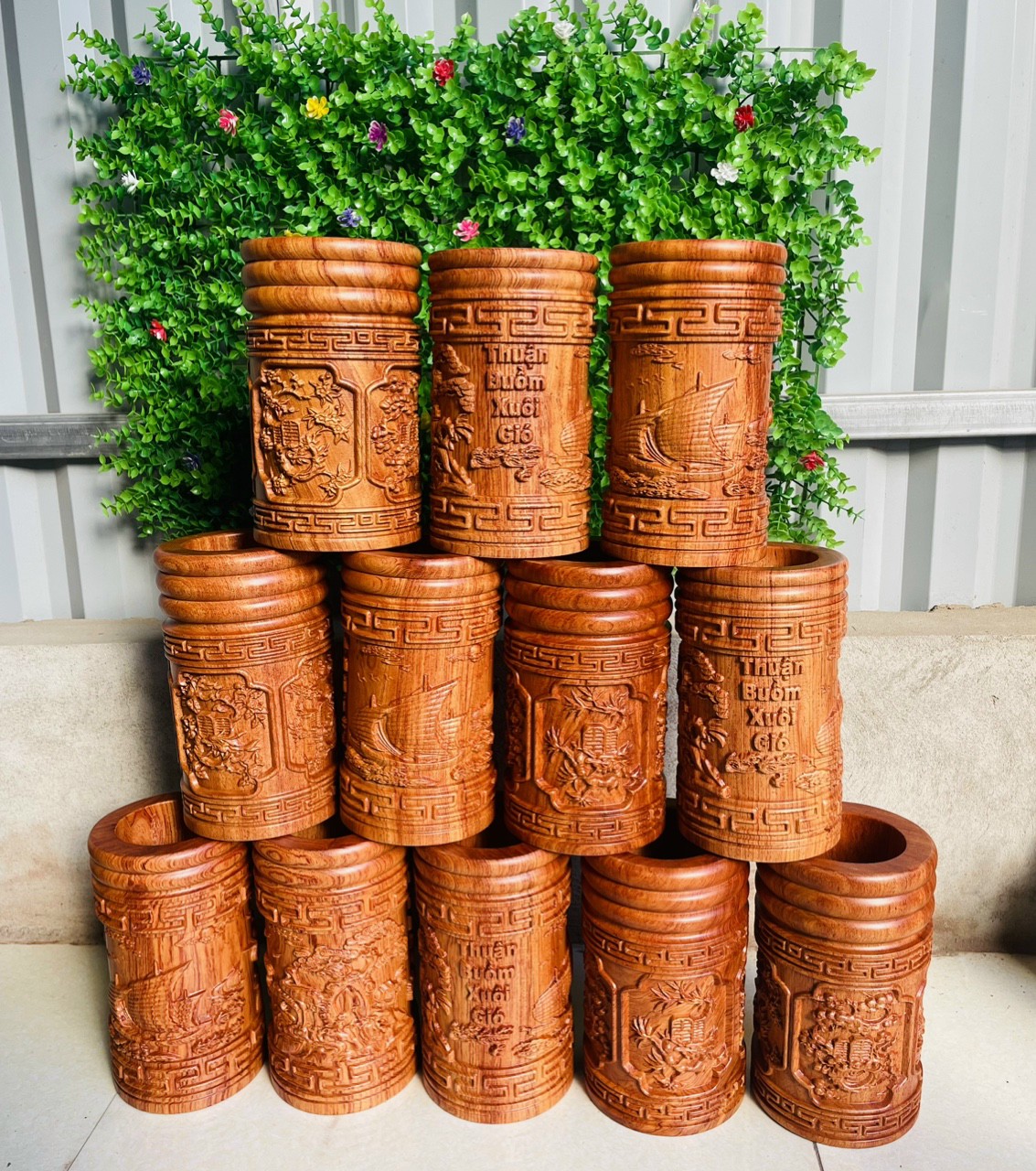 ✨Ống cắm bút trạm khắc thân bút nhiều tích hoa văn khác nhău bằng gô hương đá kt cao 20×12×12cm
