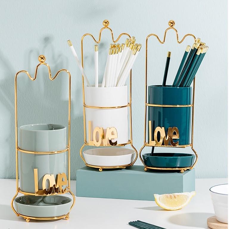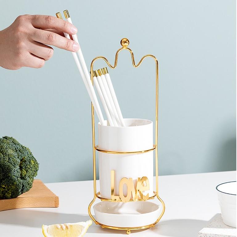 ✨Ống đựng đũa chất liệu sứ khung hợp kim cao cấp | HŨ SỨ CÓ KHAY HỨNG NƯỚC ĐỰNG ĐŨA KHUNG INOX TẠO HÌNH LOVE YOU