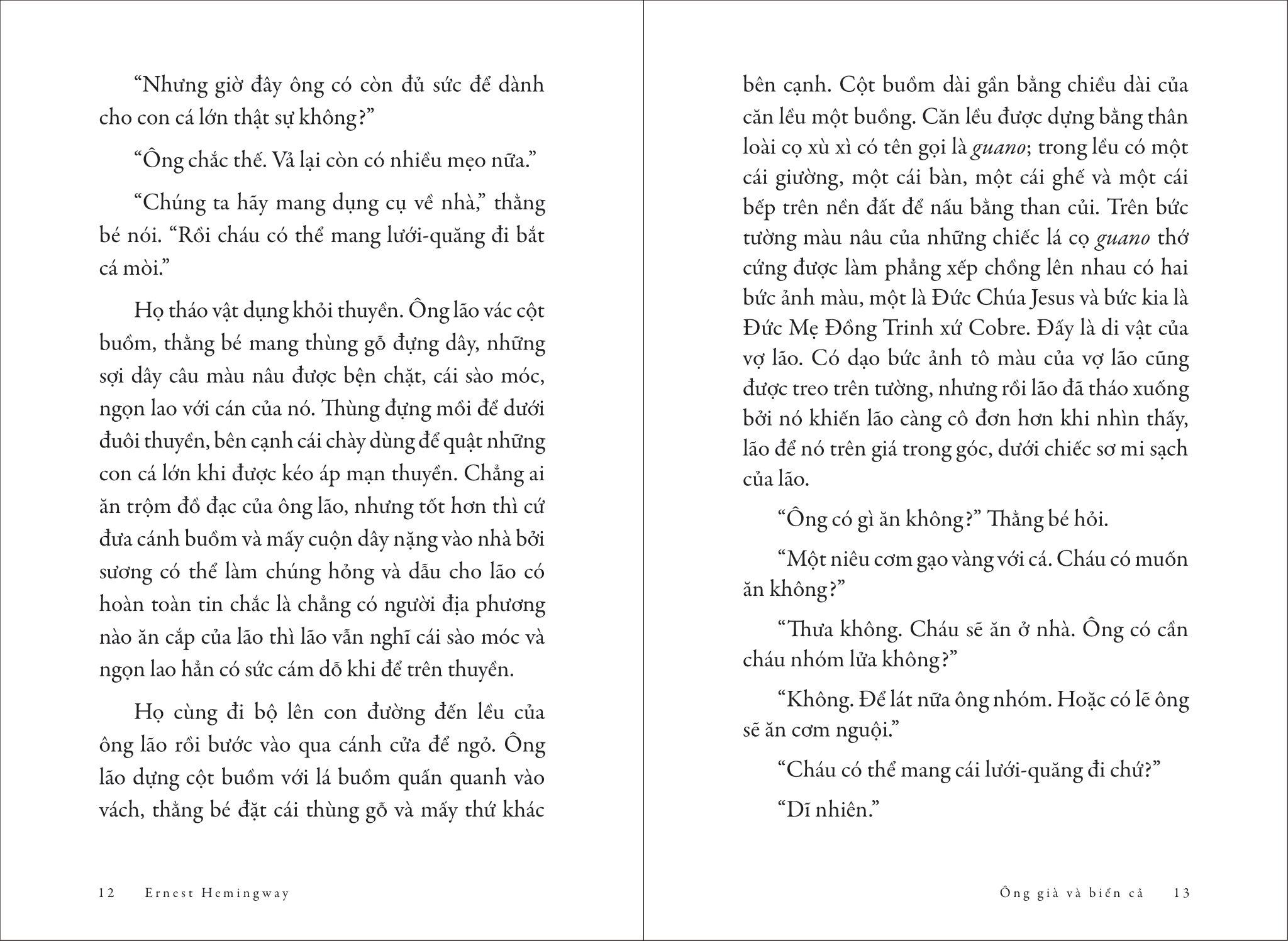 ÔNG GiÀ VÀ BIỂN CẢ kể về ông lão đánh cá nghèo khổ, một mình vật lộn ở đại dương ba ngày liền với con cá kiếm khổng lồ, không nản lòng, luôn tin tưởng sẽ đánh được một mẻ cá lớn xứng đáng với uy danh thời trai trẻ của mình. Cốt truyện hết sức đơn giản nhưng phô diễn nghệ thuật độc thoại nội tâm đạt tới mức đỉnh cao, theo nguyên lí tảng băng trôi của Hemingway. Tác phẩm như một bản hùng ca ca ngợi nghị lực và sức lao động phi thường của con ngườ