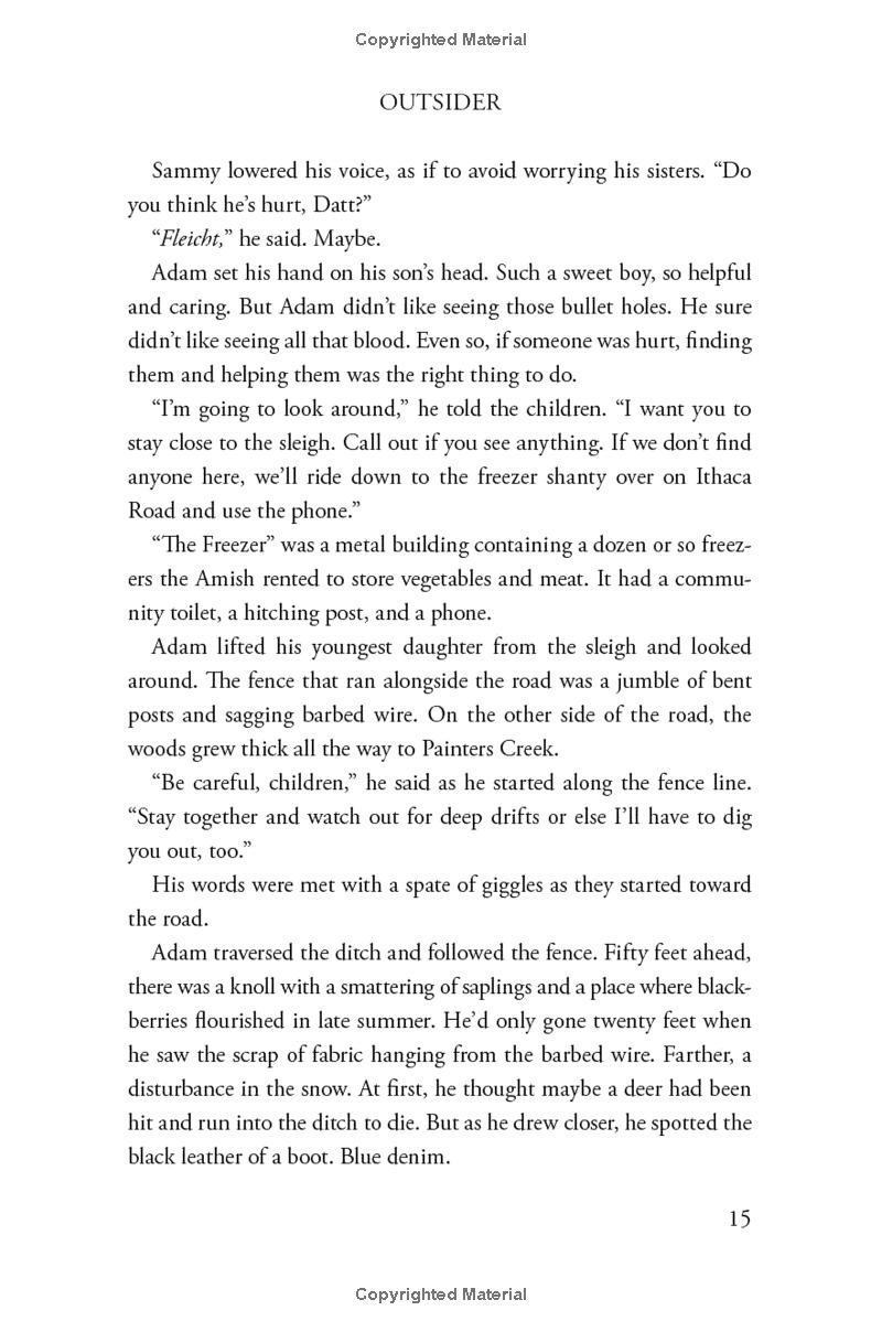 Outsider: A Novel Of Suspense Chief of Police Kate Burkholder’s past comes back to haunt her when she receives a call from Amish widower Adam Lengacher. While enjoying a sleigh ride with his children, he