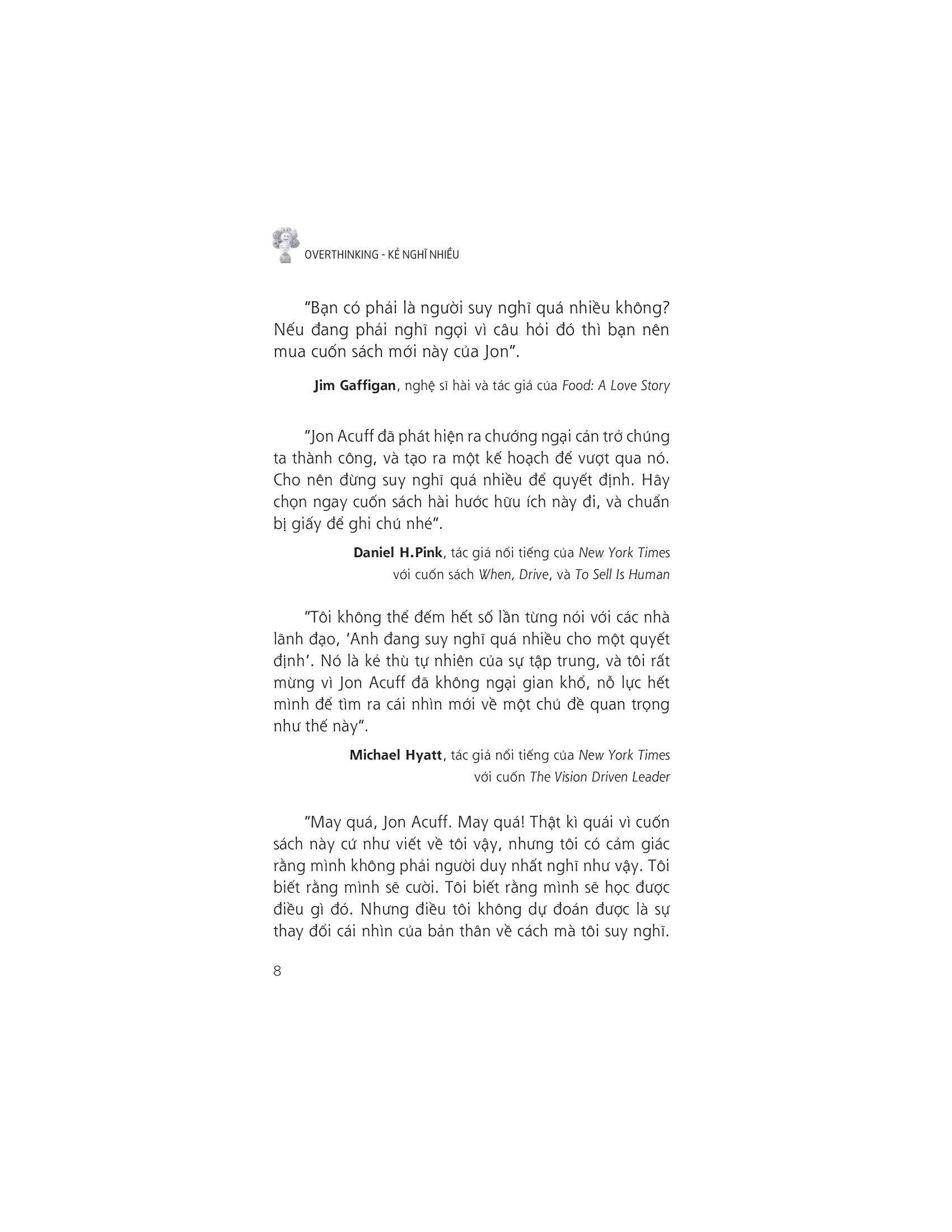 “Tôi không thể đếm hết số lần từng nói với các nhà lãnh đạo, ‘Anh đang suy nghĩ quá nhiều cho một quyết định’. Nó là kẻ thù tự nhiên của sự tập trung, và tôi rất mừng vì Jon Acuff đã không ngại gian khổ, nỗ lực hết m.ình để tìm ra cái nhìn mới về một chủ đề quan trọng như thế này”.