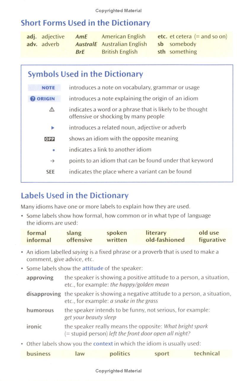- Contains a wide range of idioms, from expressions used in business and newspapers to very up-to-date informal English and slang expressions.