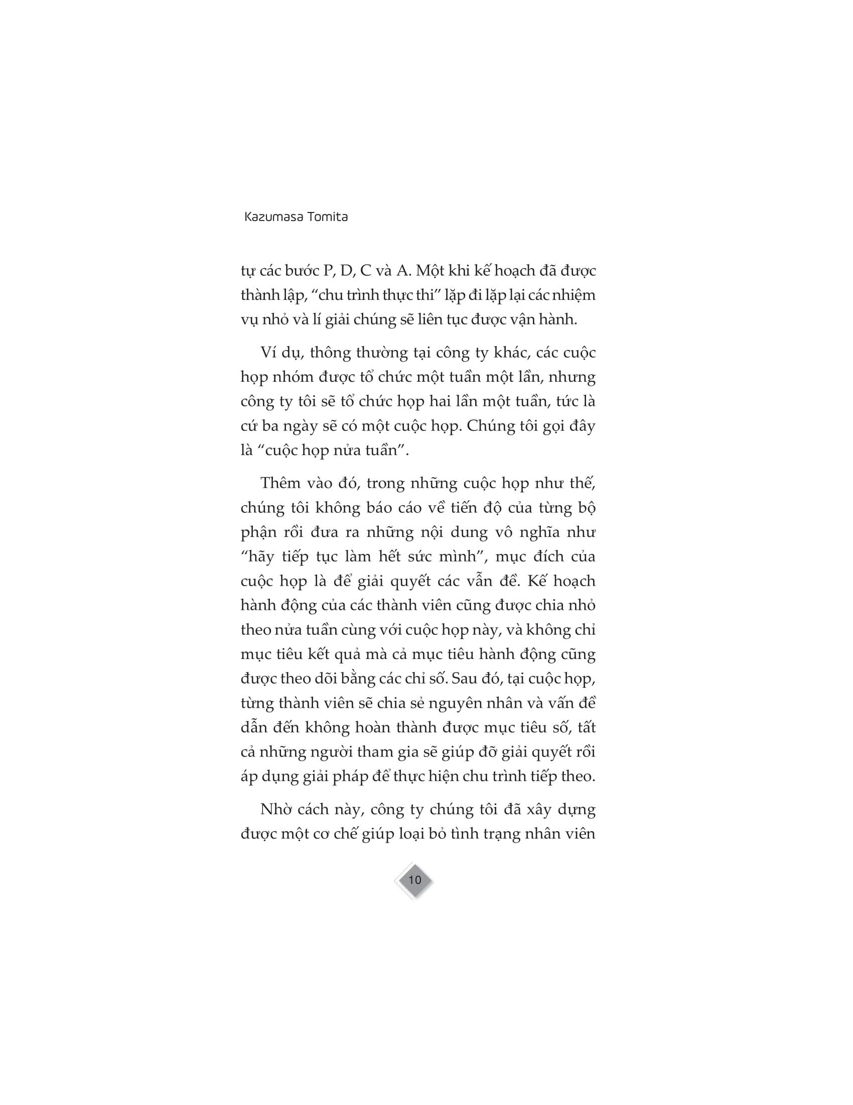 Chu trình PDCA bao gồm bốn bước PLAN (kế hoạch), DO (thực hiện), CHECK (tự đánh giá) và ADJUST (điều chỉnh), là một khuôn khổ cổ điển mà mọi doanh nhân đều biết, tuy nhiên, lại không nhiều người hiểu được hết để áp dụng trong doanh nghiệp của mình. Nhưng một khi nắm vững chu trình PDCA và thực hiện nó, bạn có thể đưa doanh nghiệp của mình phát triển với tốc độ chóng mặt; bạn sẽ không còn do dự hay lo lắng về những quyết định của mình; bạn sẽ luôn giữ được động lực để thực hiện mục tiêu đã đề ra ban đầu và doanh nghiệp hay thậm chí chính cuộc sống cá nhân của bạn sẽ đạt được kết quả tối ưu nhất.