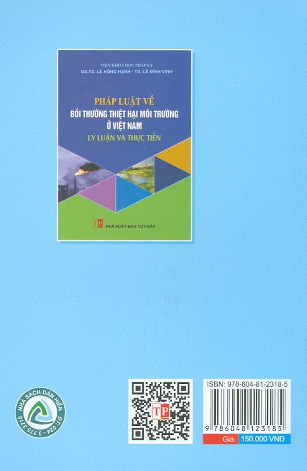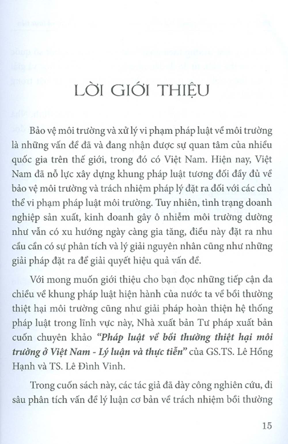 Hy vọng cuốn sách là tài liệu tham khảo hữu ích cho những ai quan tâm đến vấn đề bảo vệ môi trường và bồi thường thiệt hại môi trường ở Việt Nam.