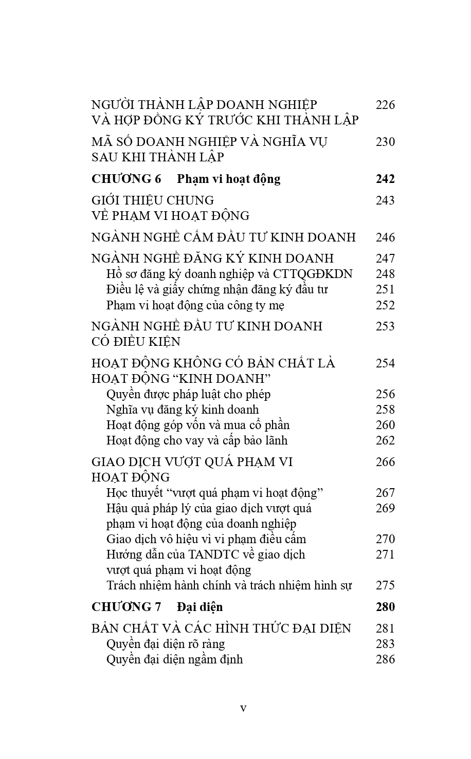 Trải dài trong hơn 1000 trang, cuốn sách phân tích các vấn đề pháp lý cơ bản liên quan đến việc thành lập, tổ chức quản lý và hoạt động của doanh nghiệp. Kết cấu của cuốn sách gồm hai mươi chương và chia làm năm phần, tập trung vào hai hình thức doanh nghiệp thông dụng nhất là công ty trách nhiệm hữu hạn (CTTNHH) và công ty cổ phần (CTCP).