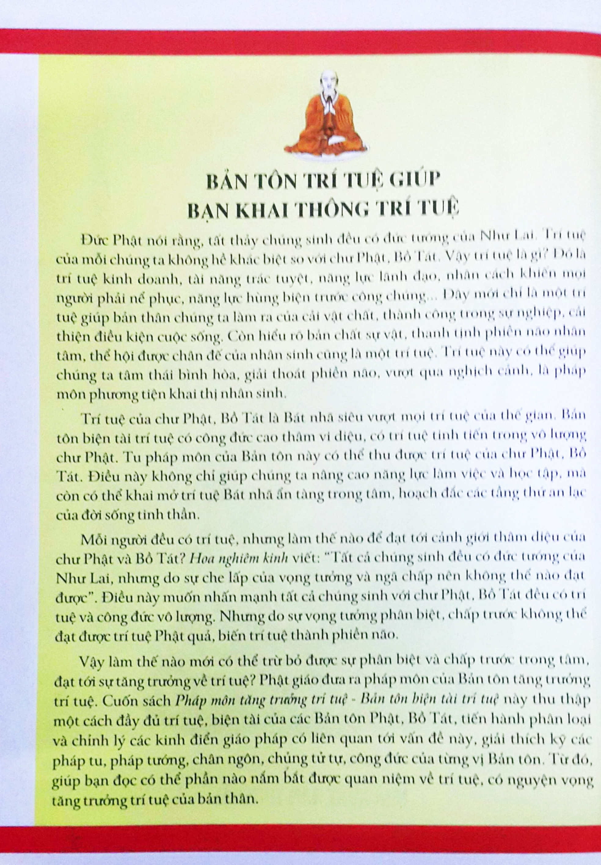 Đối với những người muốn tăng trưởng trí tuệ có thể chọn cho mình một Bản tôn Phật, Bồ Tát tương xứng. Làm thế nào có thể tăng trưởng trên phương diện trí tuệ? Sau khi tu pháp môn Bản tôn trí tuệ, làm thế nào thu được thành tựu và công đức? Đây chính là những thông tin mà cuốn sách cung cấp cho bạn đọc. Thông qua 300 hình vẽ sinh động, 100 biểu đồ minh họa tường tận về pháp môn tăng trưởng trí tuệ, cùng với việc phân chia chương mục khoa học, giúp bạn đọc có thể nắm bắt được vấn đề một cách nhanh nhất.