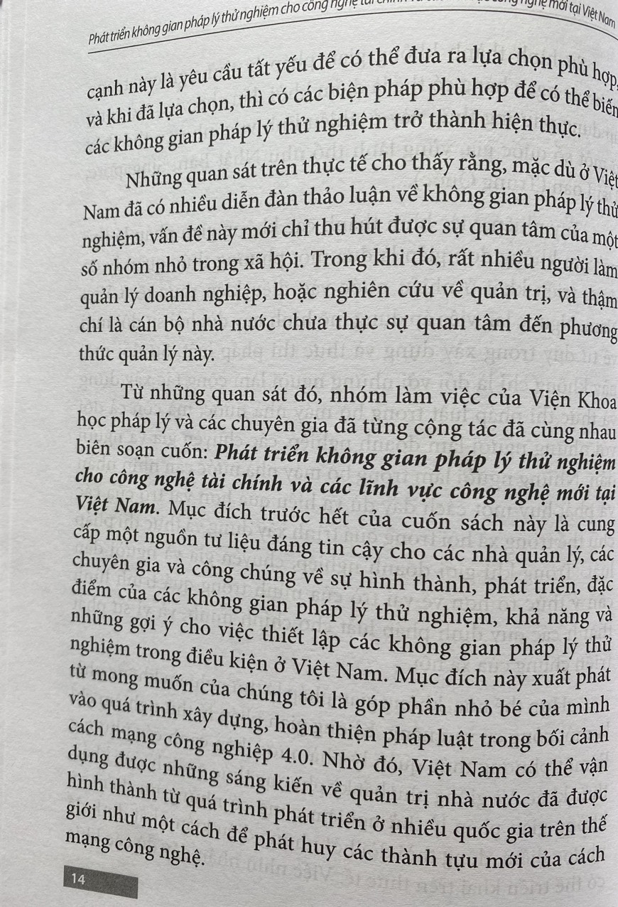 Từ những quan sát đó, nhóm làm việc của Viện Khoa học pháp lý và các chuyên gia từng cộng tác đã cùng nhau biên soạn cuốn sách: Phát triển không gian pháp lý thử nghiệm (Regulatory Sandbox) cho FinTech và các lĩnh vực công nghệ mới tại Việt Nam. Mục đích trước hết của cuốn sách này là cung cấp một nguồn tư liệu đáng tin cậy cho những người quản lý, các chuyên gia và công chúng về sự hình thành, phát triển, đặc điểm của các không gian pháp lý thử nghiệm, khả năng và những gợi ý cho việc thiết lập các không gian pháp lý thử nghiệm trong điều kiện ở Việt Nam. Mục đích này xuất phát từ mong muốn của chúng tôi là góp phần nhỏ bé của mình vào quá trình xây dựng, hoàn thiện pháp luật trong bối cảnh CMCN 4.0. Nhờ đó, Việt Nam có thể tận dụng được những sáng kiến về quản trị nhà nước đã được hình thành từ quá trình phát triển ở nhiều quốc gia trên thế giới như một cách để tận dụng được những thành tựu mới của cuộc cách mạng công nghệ.