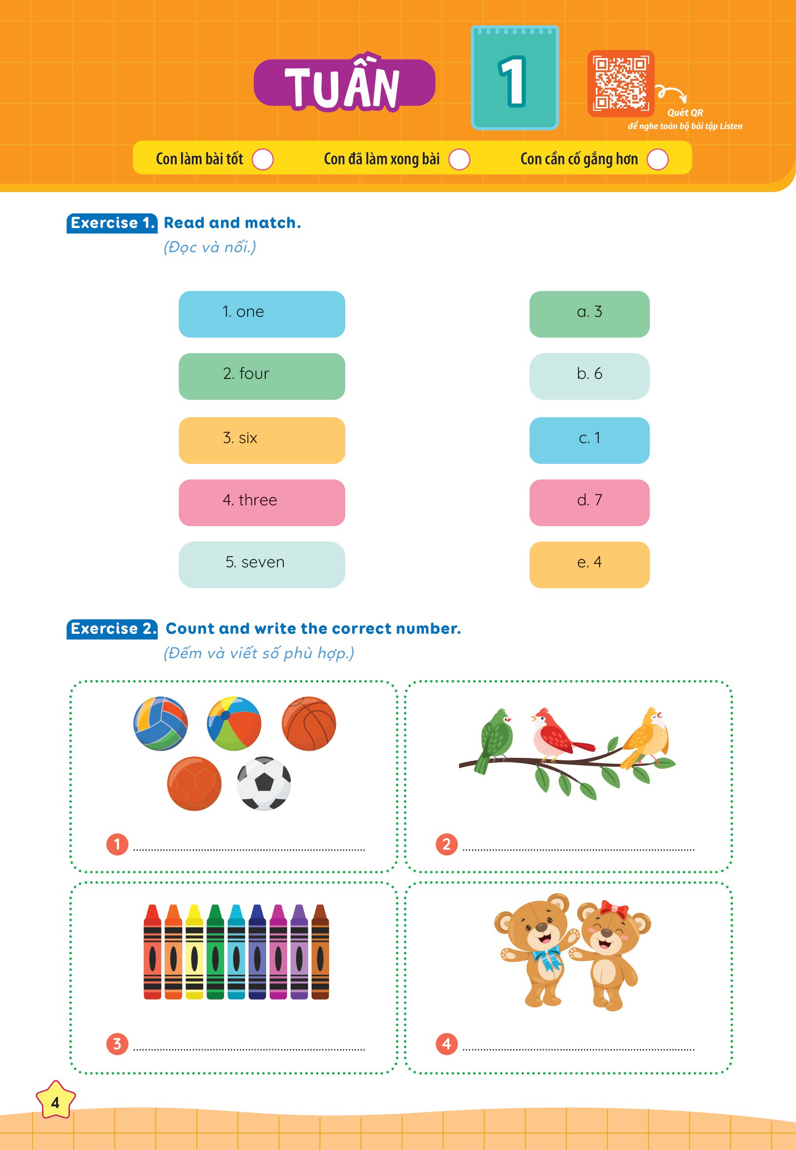 Mỗi bài tập đi kèm với mã QR cho phép truy cập vào file nghe phát âm chuẩn của từ vựng. Điều này giúp các em học sinh luyện nghe và học phát âm chính xác ngay từ đầu, xây dựng nền tảng ngôn ngữ vững chắc.