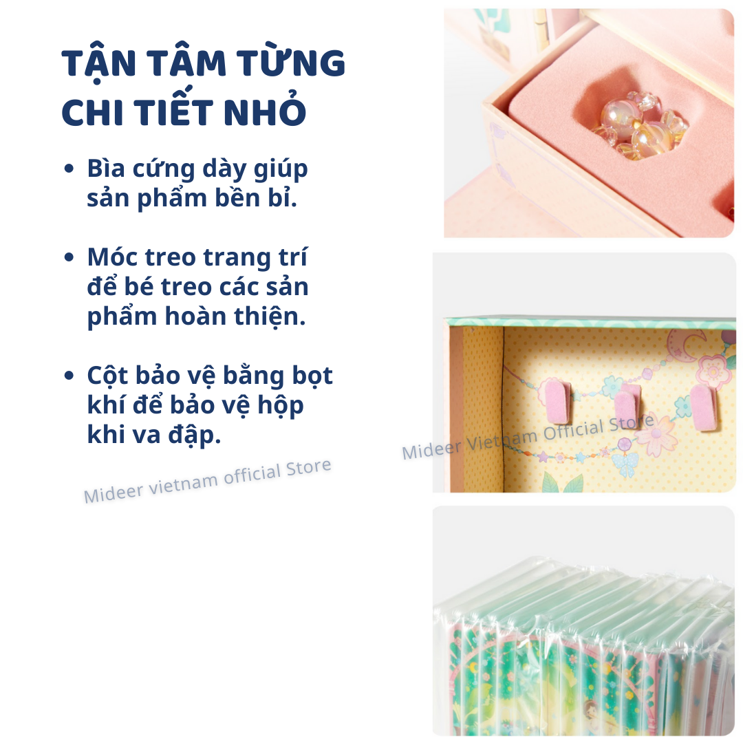 - TẬN TÂM TỪNG CHI TIẾT NHỎ Bìa cứng dày giúp sản phẩm bền bỉ. Móc treo trang trí để bé treo các sản phẩm hoàn thiện. Cột bảo vệ bằng bọt khí để bảo vệ hộp khi va đập. Bộ phụ kiện cho bé gái vòng tay, vòng charm, sơn móng tay Mideer Girls Power Lacing Beads