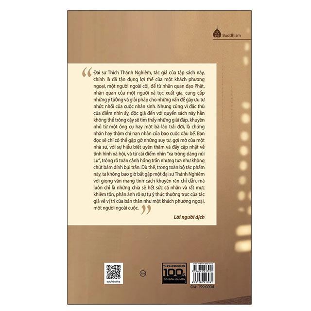 [Thaihabooks] Hòa thượng Thích Thánh Nghiêm là đã tận dụng lợi thế của một khách phương ngoại, một người ngoài cõi, để từ nhãn quan đạo Phật, nhãn quan của một người xả tục xuất gia, cung cấp những ý tưởng và giải pháp cho những vấn đề gây ưu tư nhức nhối của cuộc nhân sinh. Nhưng cũng vì đặc thù của điểm nhìn ấy, độc giả đến với quyển sách này hẳn không thể trông cậy sẽ tìm thấy những giải đáp, khuyên nhủ từ một ông cụ hay một bà lão trải đời, là chứng nhân hay thậm chí nạn nhân của bao cuộc bể dâu. Bạn đọc sẽ chỉ có thể gặp gỡ những suy tư, gợi mở của một nhà sư, với sự hiểu biết uyên thâm và đầy cập nhật về tình hình xã hội, và từ cái điểm nhìn “xa trông dáng núi Lư”, trông rõ toàn cảnh hồng trần nhưng tựa như không chút bám dính bụi trần. Dù thế, trong toàn bộ tác phẩm này, ta không bao giờ bắt gặp một đại sư Thánh Nghiêm với giọng văn mang tính cách khuyên răn chỉ dẫn, mà luôn chỉ là những chia sẻ hết sức cá nhân và rất mực khiêm tốn, phản ánh rõ sự tự ý thức thường trực của tác giả về vị trí của bản thân như một khách phương ngoại, một người ngoài cuộc.