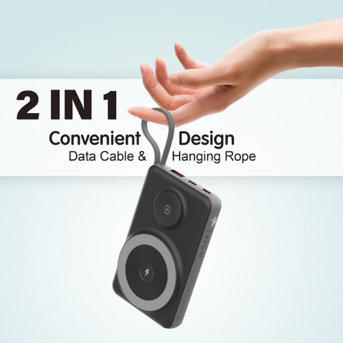 Được tích hợp thêm quai cầm, có thể móc balo hoặc treo vào bất cứ đâu để mang đi mọi nơi rất tiện lợi. Đồng thời cũng là 2 cáp sạc Type-C và Light.ning độc lập dễ dàng tháo và sạc bất cứ đâu.