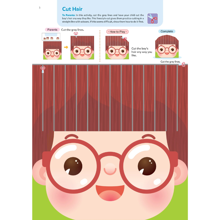 Play Smart Cutting and Pasting 3+ is a book designed for children aged 3 and up, focusing on developing cutting, pasting, and fine motor skills. The book includes various engaging games and challenges such as cutting lines and shapes, labeling, using stickers, solving mazes, and counting. These activities are designed to help children get familiar with scissor skills and strengthen their fine motor abilities, thereby making them more confident and independent as they prepare for kindergarten.