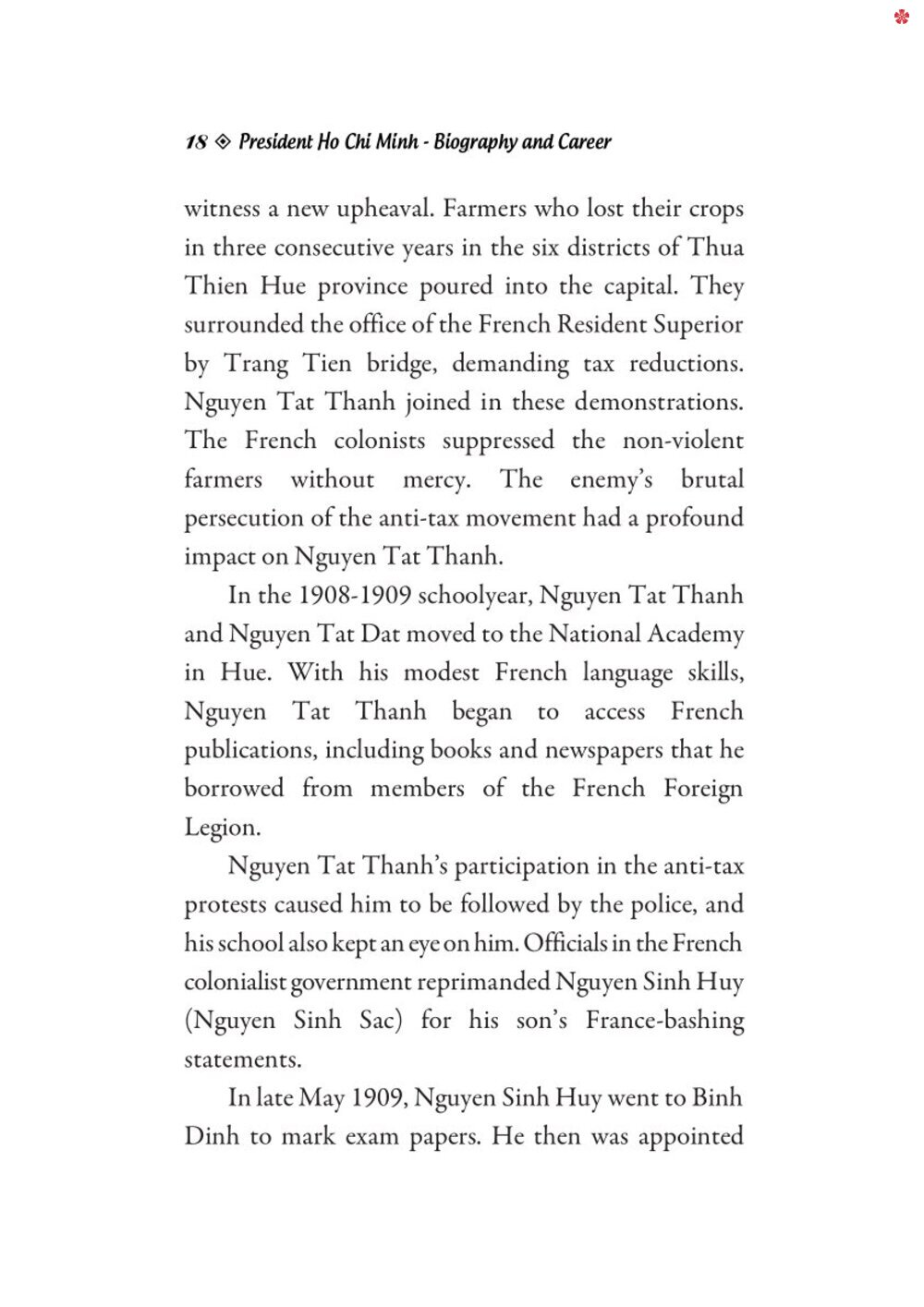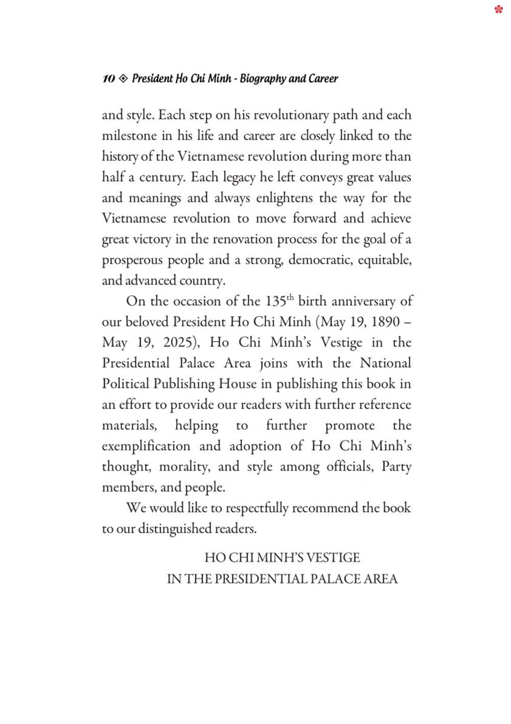 Ho Chi Minh is a great symbol of true patriotism in harmony with proletarian internationalism. He has devoted his entire life to his homeland and people, leaving behind a bright example of a great man with great mind and great courage. There have been numerous works on Ho Chi Minh's life, revolutionary career, thought, morality, and style in Vietnamese and other languages. Among them, the book President Ho Chi Minh - Biography and Career compiled and organized for translation by Ho Chi Minh’s Vestige in the Presidential Palace Area is a valuable work containing most of the essential information that many readers in Viet Nam and abroad desire to learn about Nguyen Ai Quoc - Ho Chi Minh.