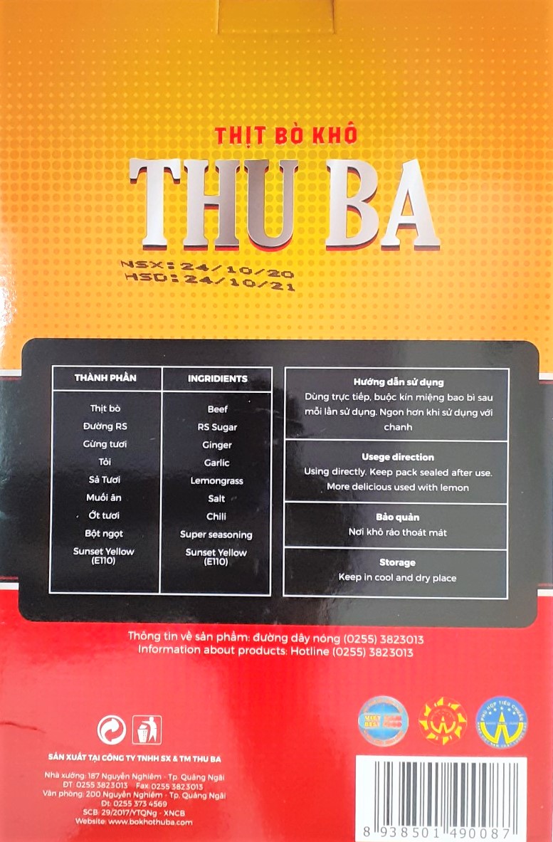 BÒ KHÔ THU BA là món đặc sản Quảng Ngãi, đạt tiêu chuẩn ISO 22000:2018 và là Hàng Việt Nam Chất Lượng Cao do Người tiêu dùng bình chọn Sản phẩm được sản xuất theo công thức
