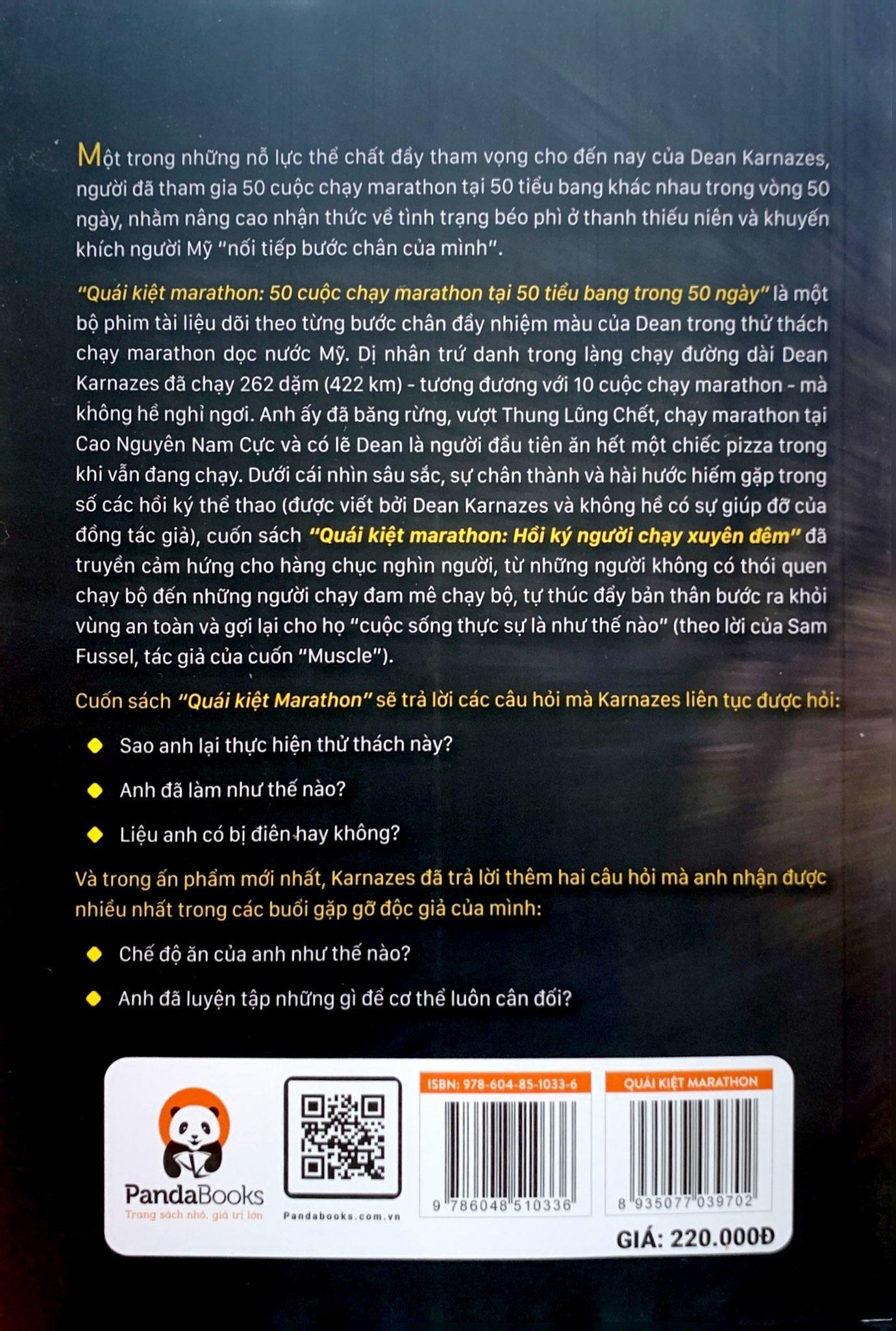 “Quái kiệt marathon: 50 cuộc chạy marathon tại 50 tiểu bang trong 50 ngày” là một bộ phim tài liệu dõi theo từng bước chân đầy nhiệm màu của Dean trong thử thách chạy marathon dọc nước Mỹ. Dị nhân trứ danh trong làng chạy đường dài Dean Karnazes đã chạy 262 dặm (422 km) – tương đương với 10 cuộc chạy marathon – mà không hề nghỉ ngơi. Anh ấy đã băng rừng, vượt Thung Lũng Chết, chạy marathon tại Cao Nguyên Nam Cực và có lẽ Dean là người đầu tiên ăn hết một chiếc pizza trong khi vẫn đang chạy. Dưới cái nhìn sâu sắc, sự chân thành và hài hước hiếm gặp trong số các hồi ký thể thao (được viết bởi Dean Karnazes và không hề có sự giúp đỡ của đồng tác giả), cuốn sách “Quái kiệt marathon: Hồi ký người chạy xuyên đêm” đã truyền cảm hứng cho hàng chục nghìn người, từ những người không có thói quen chạy bộ đến những người chạy đam mê chạy bộ, tự thúc đẩy bản thân bước ra khỏi vùng an toàn và gợi lại cho họ “cuộc sống thực sự là như thế nào” (theo lời của Sam Fussel, tác giả của cuốn “Muscle”).