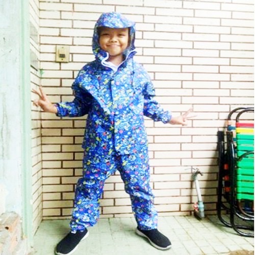 Chất liệu: Polyester, chống thấm nước Màu sắc: màu Hồng, Xanh biển Kích thước: thích hợp bé cao dưới 1M3, nặng 25kg đổ lại Bộ sản phẩm: 1 áo mưa, túi đựng áo mưa Kiểu
