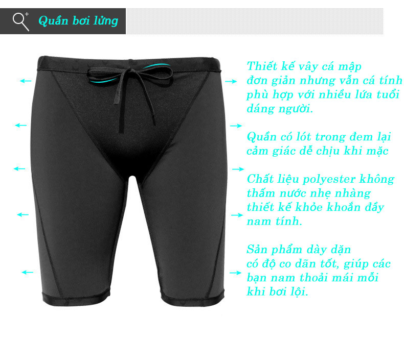 - Mẫu quần bơi nam cao cấp dáng ngắn mới, chống thấm nước, thoáng mát, nhanh khô. - Chất thun bơi lạnh Spandex loại đẹp, co giãn tốt ôm gọn gàng, giúp thoải mái khi
