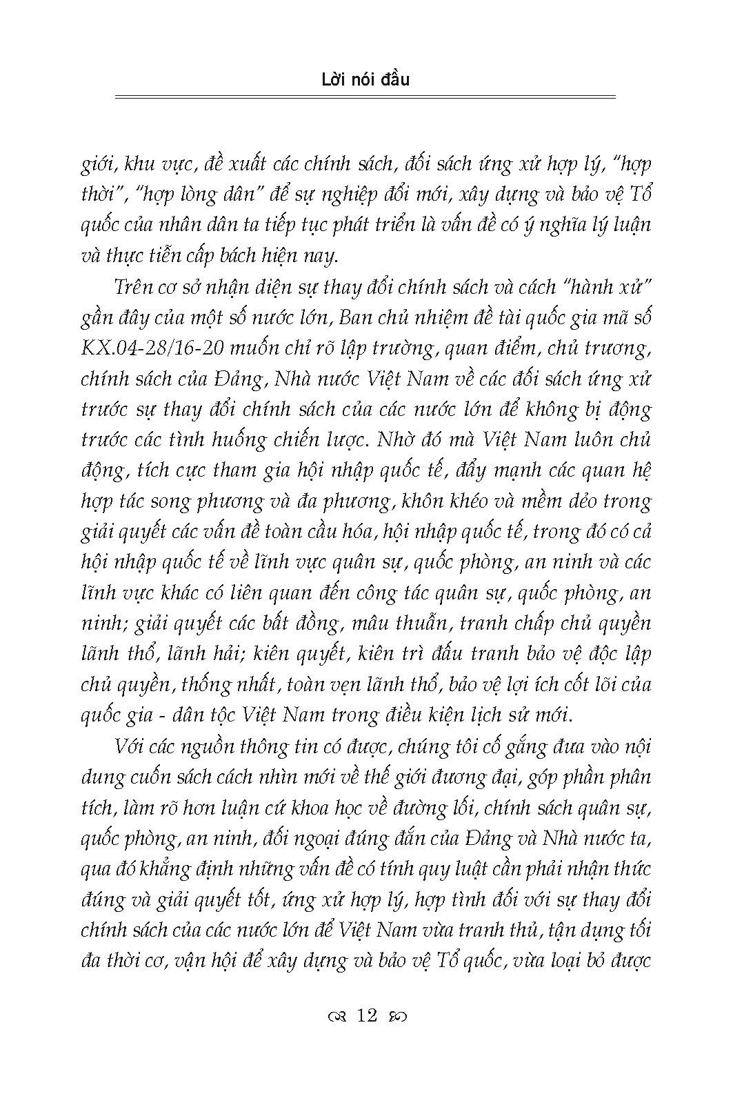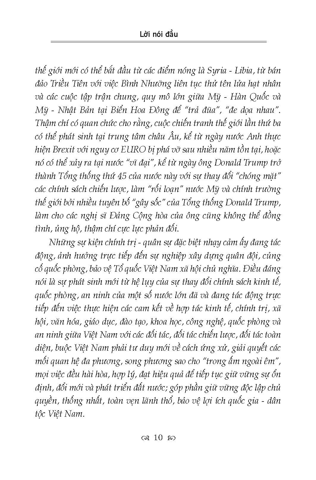 Cuốn sách trình bày những vấn đề cơ bản nhất của cuộc cách mạng khoa học và công nghệ hiện đại, kinh tế tri thức và toàn cầu hóa; quan hệ giữa chủ nghĩa xã hội và chủ nghĩa tư bản; chiến tranh và xung đột quân sự trong thế giới đương đại; các nước lớn và cạnh tranh chiến lược giữa các nước lớn, đặc biệt là sự cạnh tranh chiến lược giữa Mỹ và Trung Quốc ở Đông Nam Á; các vấn đề an ninh phi truyền thống. Trên cơ sở đó, cuốn sách trình bày rõ quan điểm của Đảng, chính sách của Nhà nước ta về các đối sách: Về hội nhập uốc tế, xây dựng thực lực mạnh; kế sách giữ nước; bảo vệ Tổ quốc xã hội chủ nghĩa; kết hợp xây dựng và bảo vệ Tổ quốc…