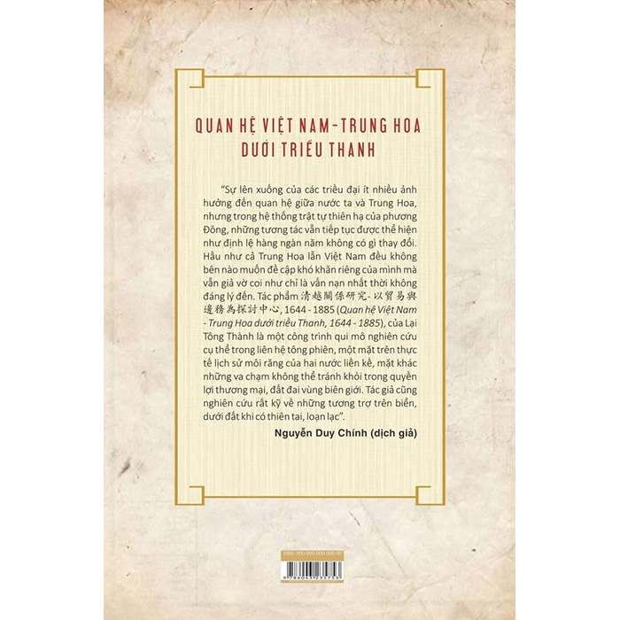 Mua tại TiktokQuan Hệ Việt Nam - Trung Hoa Dưới Triều Thanh (Bìa Cứng) Nghiên cứu về quan hệ Thanh - Việt cũng là một mắt xích trong quan hệ Trung - Việt vì là quan hệ của ảnh hưởng của hoàn cảnh chính trị nên đề tài nghiên cứu này dường như có xu thế biên duyên hóa. Trong khi giới học thuật liên tục xuất bản các loại sử liệu tập như: Trung Nhật quan hệ sử liệu, Trung Lưu quan hệ sử liệu, Cận đại Trung Hàn quan hệ sử tư liệu vựng biên, Trung Nga quan hệ sử liệu, Thanh quí Trung Nhật Hàn quan hệ sử liệu..., không chỉ nghiên cứu về các quan hệ mà còn đi xa hơn để thúc đẩy các động hưởng nghiên cứu, Trung Việt quan hệ sử liệu vẫn còn là một khoảng trống, do đó biên soạn về đề tài này càng sớm càng tốt là điều cần thiết.