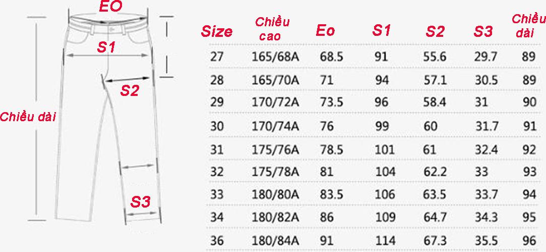 CÁCH CHỌN SIZE SIZE 28: Dành cho người cao dưới 1m70, nặng 45 - 50Kg, vòng bụng 79cm SIZE 29: Dành cho người cao dưới 1m71, nặng 50 - 55Kg, vòng bụng 81cm SIZE 30: