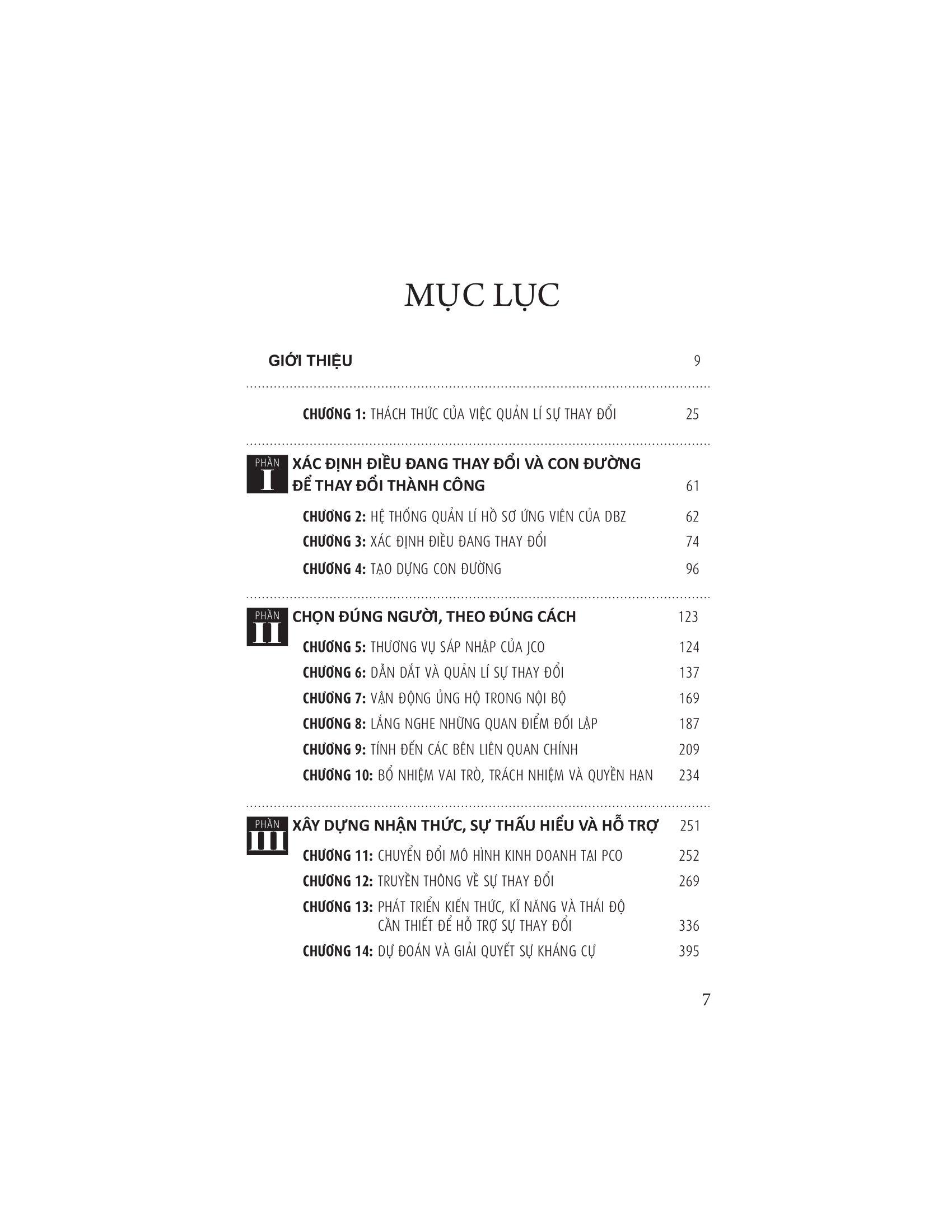 Quản Lí Quy Trình Và Con Người Để Thay Đổi Thành Công Về tác giả Kathryn Zukof có bằng Tiến sĩ về tâm lí xã hội và bằng Thạc sĩ quản trị kinh doanh về tiếp thị. Hiện bà đã có hơn 30 năm kinh nghiệm làm việc và giảng dạy trong lĩnh vực học tập và phát triển tổ chức. Trước đó, bà giữ vai trò xây dựng quan hệ với khách hàng, phát triển sản phẩm và tiếp thị trong lĩnh vực dịch vụ công nghệ. Về cuốn sách Quản Lí Quy Trình Và Con Người Để Thay Đổi Thành Công Trong công việc, và có khi cả trong đời sống cá nhân, chúng ta đều nghe người khác nói rằng chỉ có sự thay đổi là bất biến. Chúng ta đang sống trong một thế giới thiên biến vô cùng, được đặc trưng bởi sự biến động, không thể lường trước. Song rất nhiều lần, những nỗ lực thay đổi của chúng ta lại không đạt được mục tiêu mong muốn. Khách hàng rời đi, có khi còn nhiều hơn trước. Năng suất vẫn như cũ, thậm chí còn sụt giảm. Chúng ta cố gắng tìm hiểu chuyện gì đã xảy ra, m.ình đã bỏ qua điều gì, và chúng ta được bảo rằng kết quả không như mong muốn cũng là chuyện thường tình. Đôi khi những thay đổi ấy có hiệu quả, đôi khi lại không. Vậy tại sao chúng ta vẫn tiếp tục thay đổi? Câu trả lời đơn giản là: chúng ta tiếp tục vì chúng ta phải làm. Cuốn sách đưa ra những phương pháp tiếp cận và công cụ để triển khai, tiếp nhận và quản lí sự thay đổi một cách hiệu quả. Cụ thể, tác giả chỉ ra rằng cần quản lí quy trình (mặt cứng) và con người (mặt mềm) của sự thay đổi và tìm ra điểm cân bằng tốt nhất giữa hai bên. Khi tích hợp cả hai, các tổ chức có thể quản lí sự thay đổi thành công và đạt được kết quả mong muốn. Đây chắc chắn là một cuốn cẩm nang hữu ích về điều hành, quản lí doanh nghiệp mà bất cứ doanh nhân nào cũng nên đọc một lần trong đời.